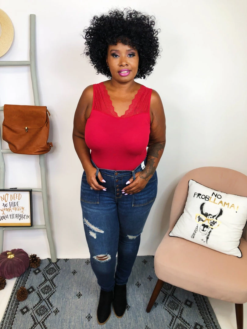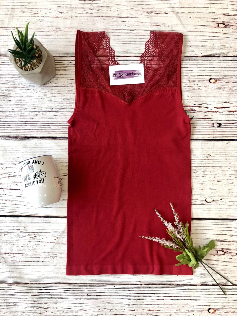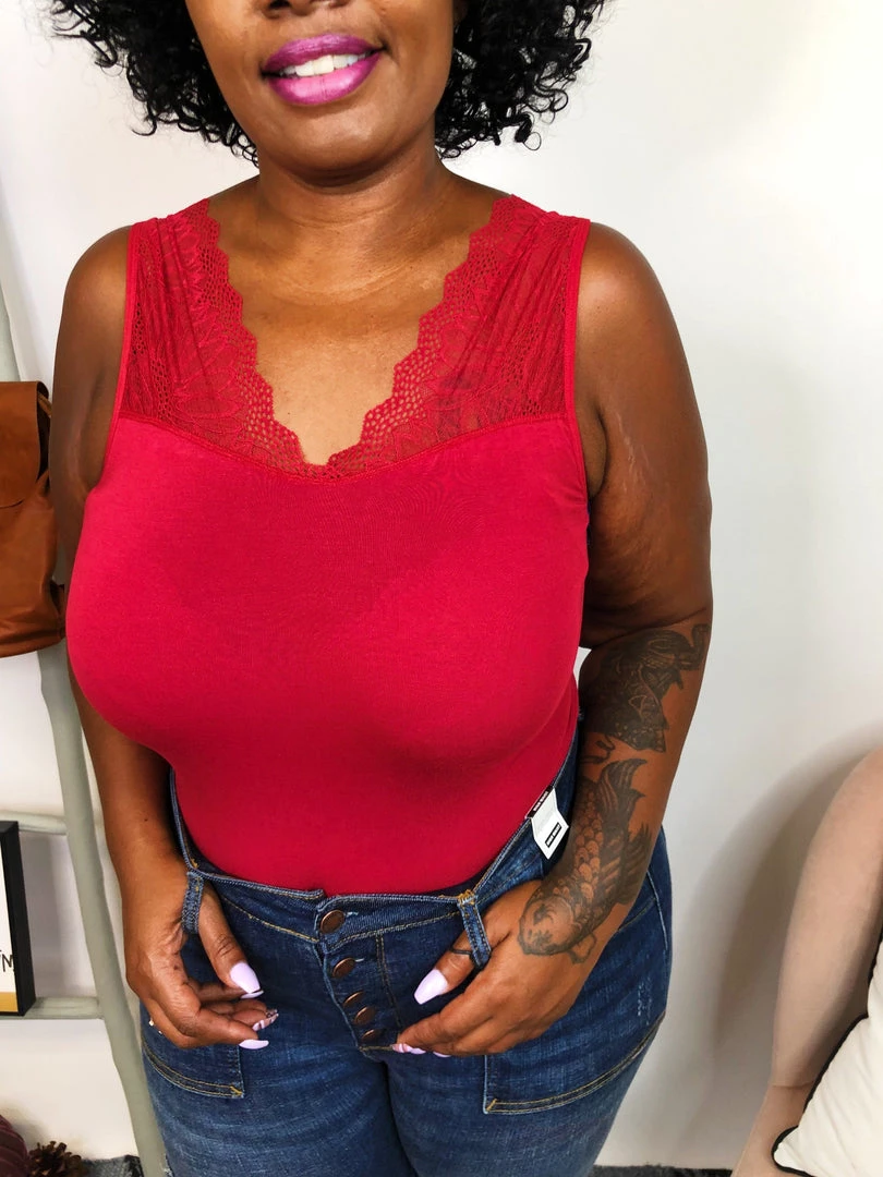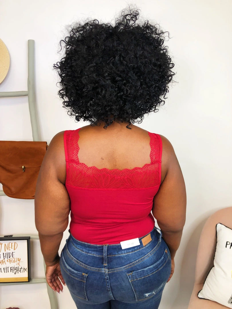 This super sexy red cami tank top will add a little spice to any outfit you pair it with. It’s super soft and stretchy, and it features a beautiful lace detail on the shoulders. It’s just the perfect piece to wear as a layer it or as is! You can’t go wrong!
