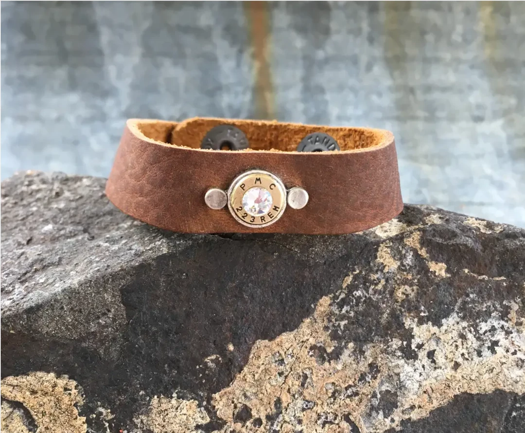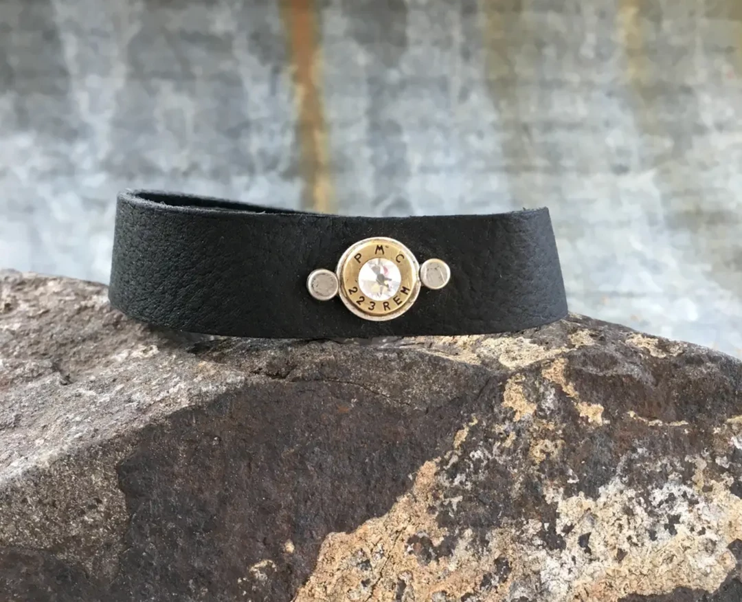 This gorgeous bracelet is made by first selecting a cowhide and cutting your 3/4″ x 9″ leather bracelet, by hand. Next, we set 2 snaps at approximately 7″ and 8″ in length. The bullet in this bracelet has been salvaged from Police Officer spent casings and is set in a .999 fine silver bezel. A Swarovski crystal completes the bullet design.