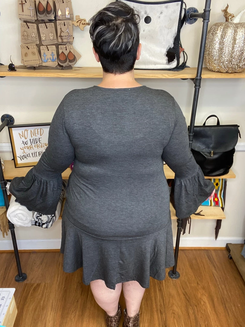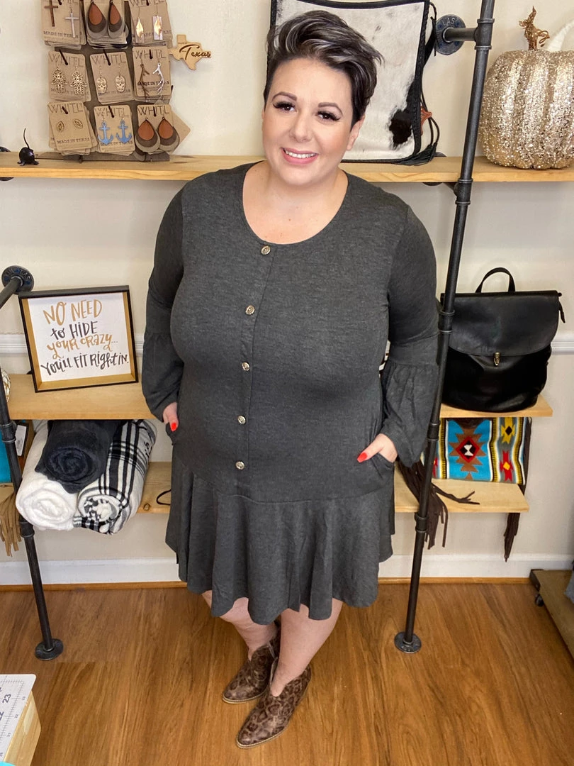 The elegant ruffle dress, features gorgeous faux sunflower buttons down the front, long bell sleeves, and side seam pockets!