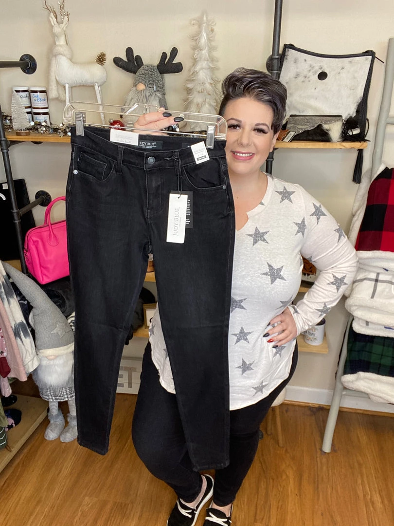 To determine the best size for you in Judy Blue jeans, take your typical department store size and go down by one. For instance, if you wear a size 6 in department store sizing, you would be a size 5 in Judy Blue jeans.