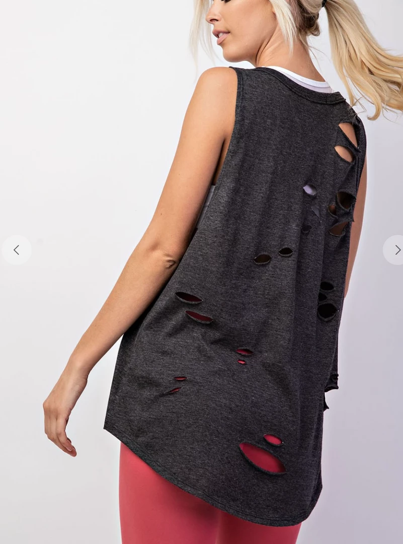 This edgy and chic tank top features distressing on the front and back! This tank top is so unique and will add that extra edge to any outfit!
