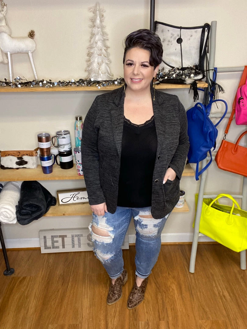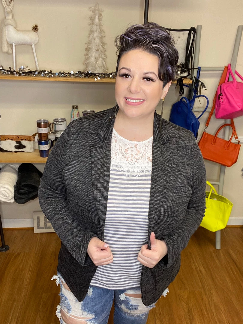 This super soft and comfy blazer will keep you warm all day while providing you the comfort of an oversized sweater.Β The black and grey mixed color pattern really pops against its ribbing.Β You must add this to your wardrobe, it will match with anything you already have.