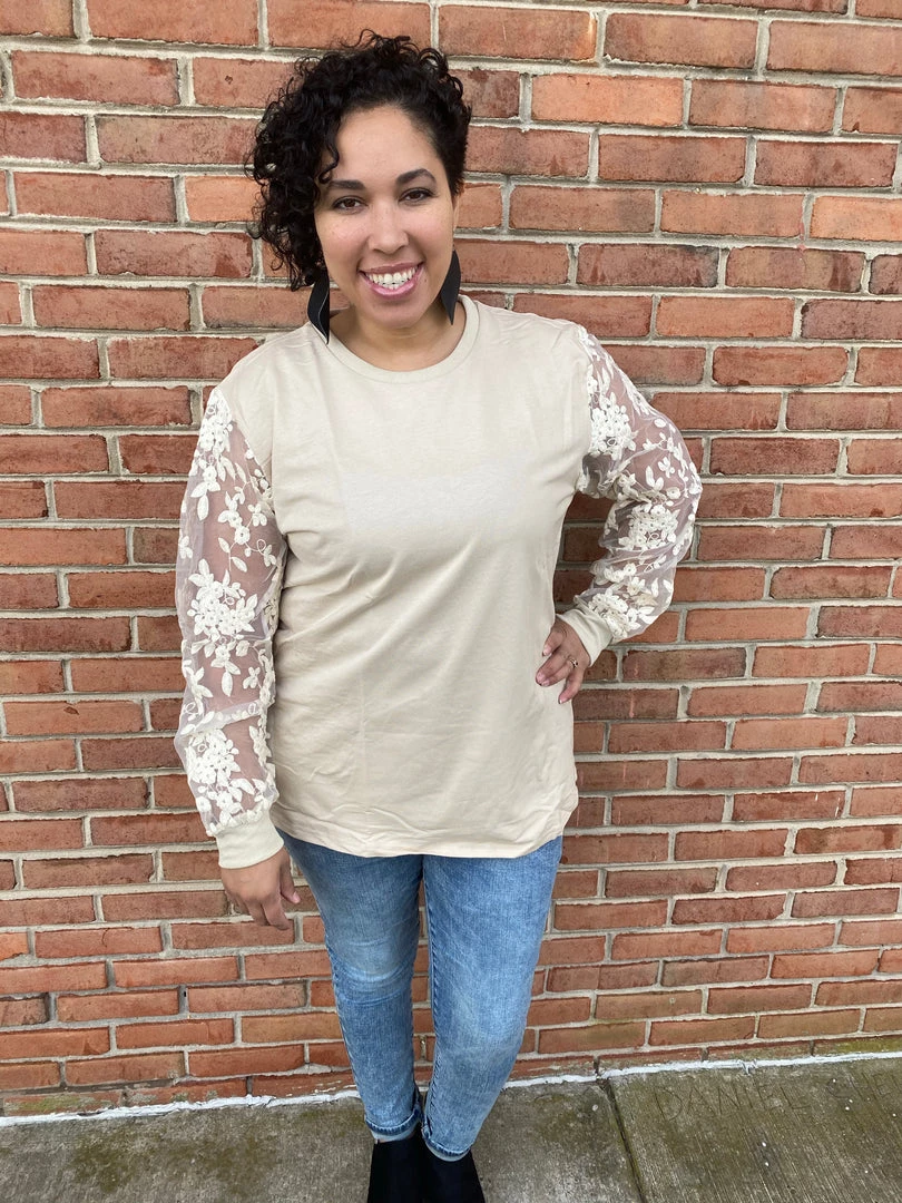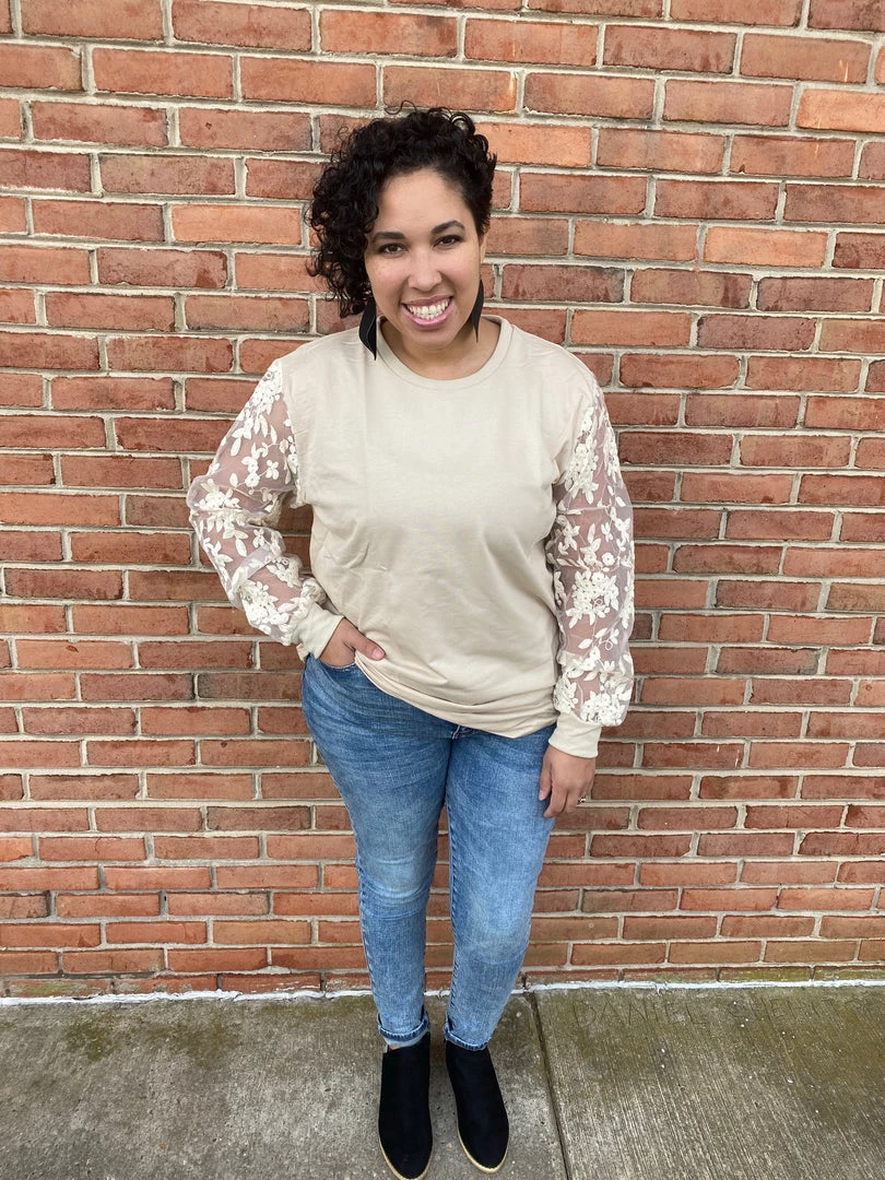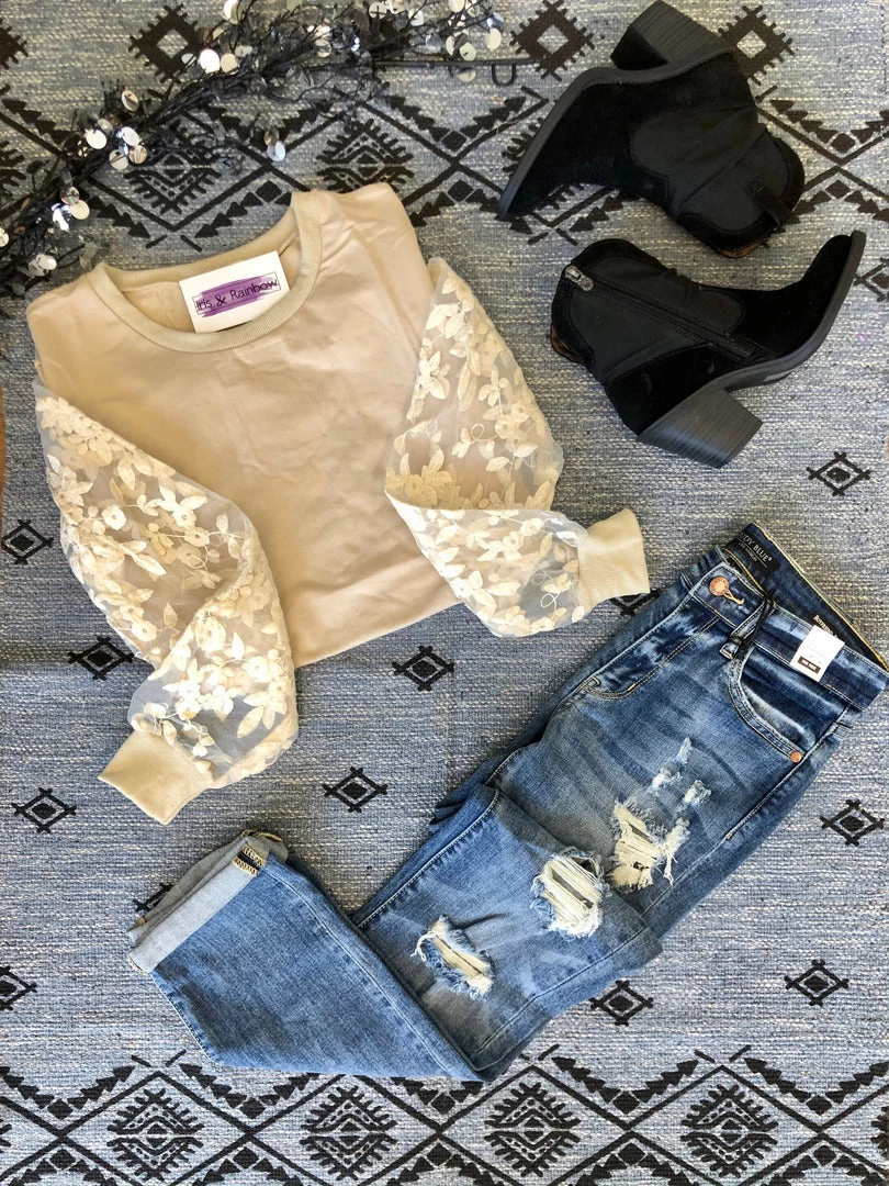 This beautiful cream colored blouse features gorgeous delicate lace puff sleeves that have cream embroidery on them. Take a whimsical walk through an orchard every day with this top!