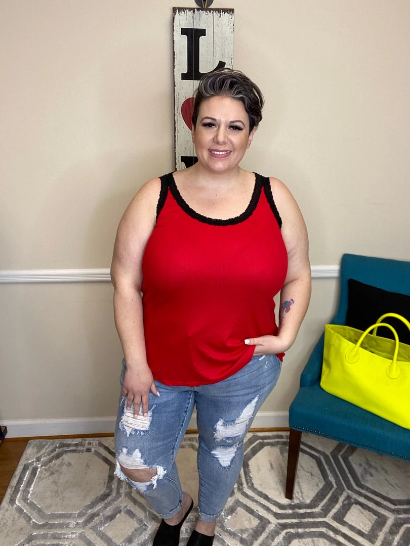This super sexy tank features a light ribbed material and black lace lining the the straps and neckline to give this tank that sultry edge!Β This top is versatile! Pair this withΒ your favorite bottoms and layer it or wear it as is for a super cute, sexy look!