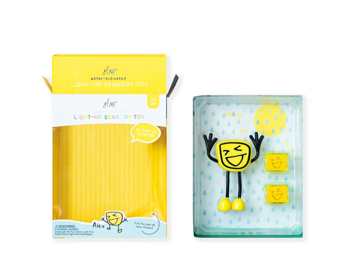 Insert your Glo Pals Light-Up Cube into the back of each Pal, drop it in the water, and watch it light up! Featuring bendable arms and colorful personalities, each Pal proudly illustrates the uniqueness in every child! Alex comes with two Glo Pals Light-Up Cubes included in the box!
