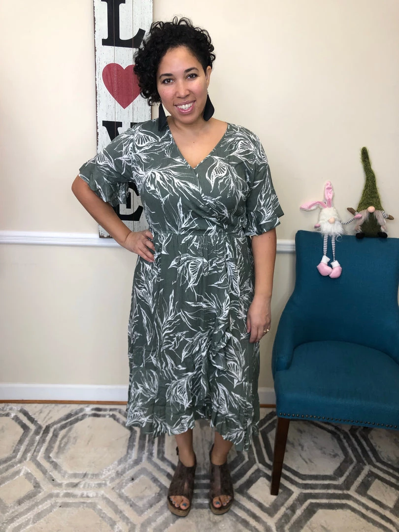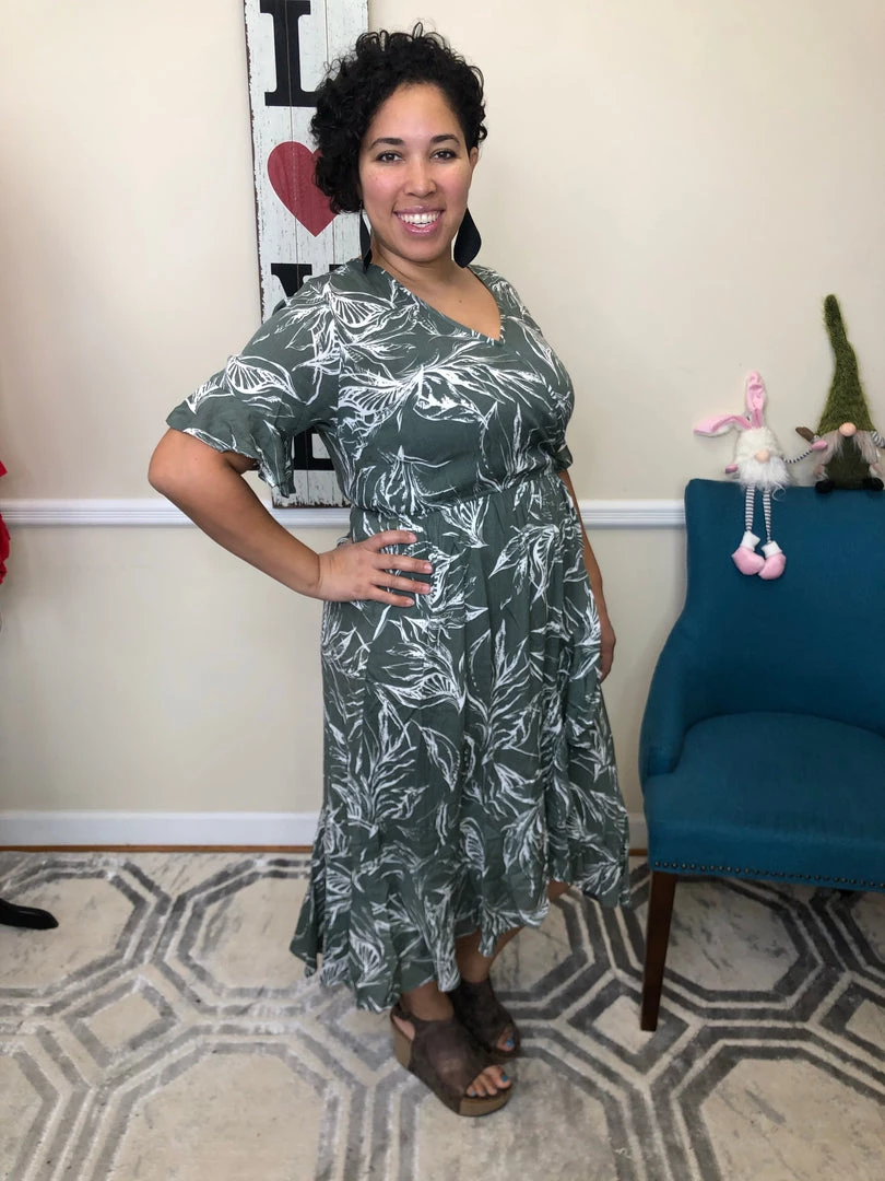 This gorgeous dress features a high low hem, a beautiful olive and white leaf print and flutter sleeves. This dress is an effortlessly chic piece that can be dressed up or dressed down!