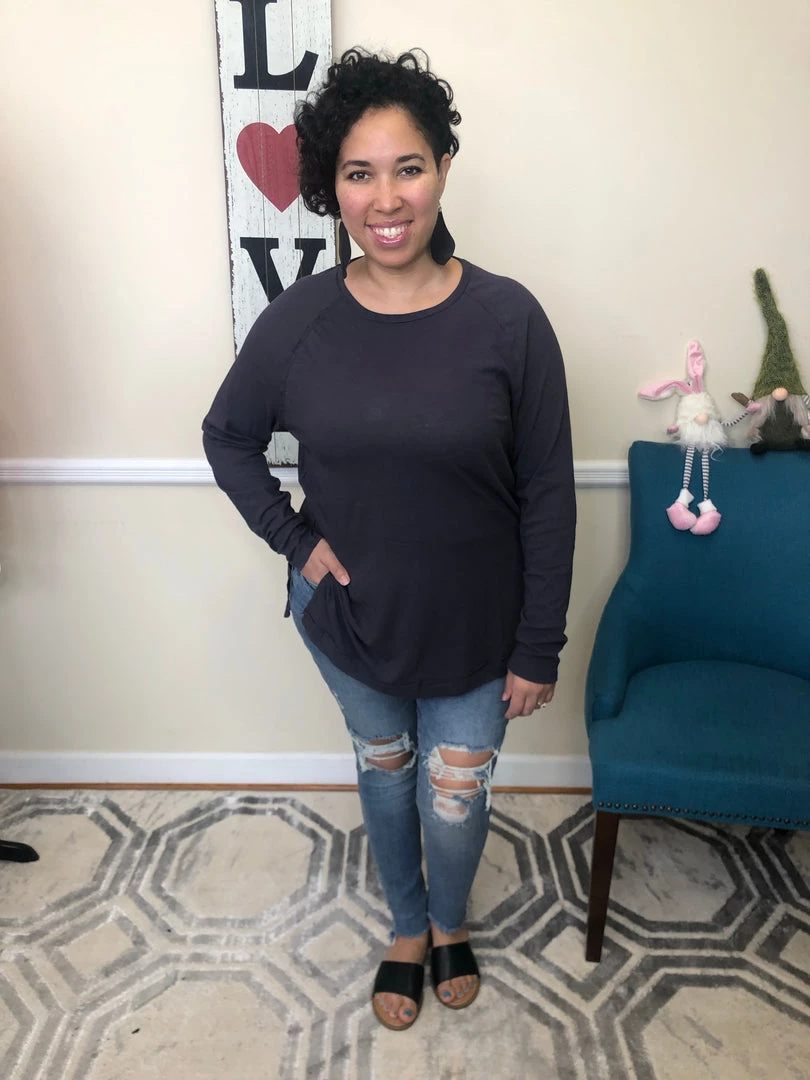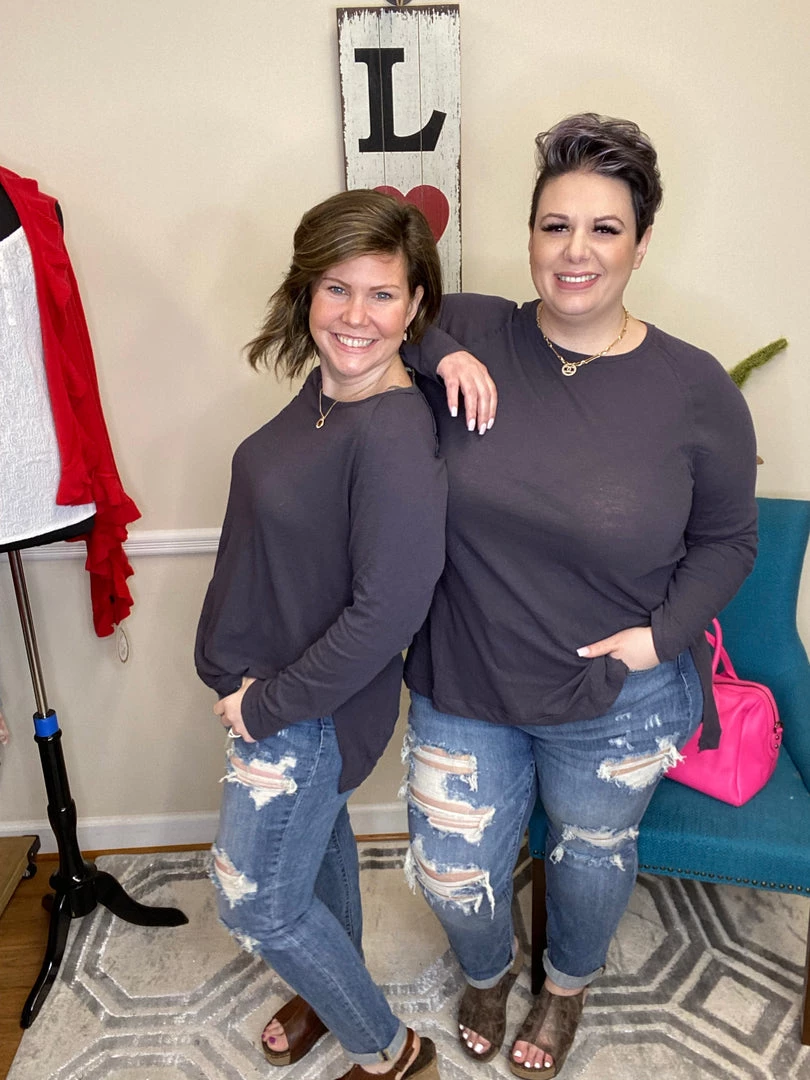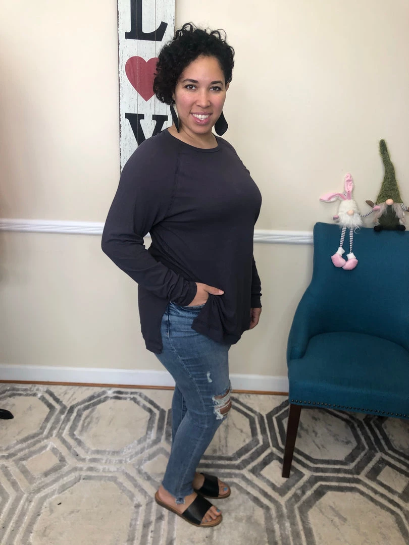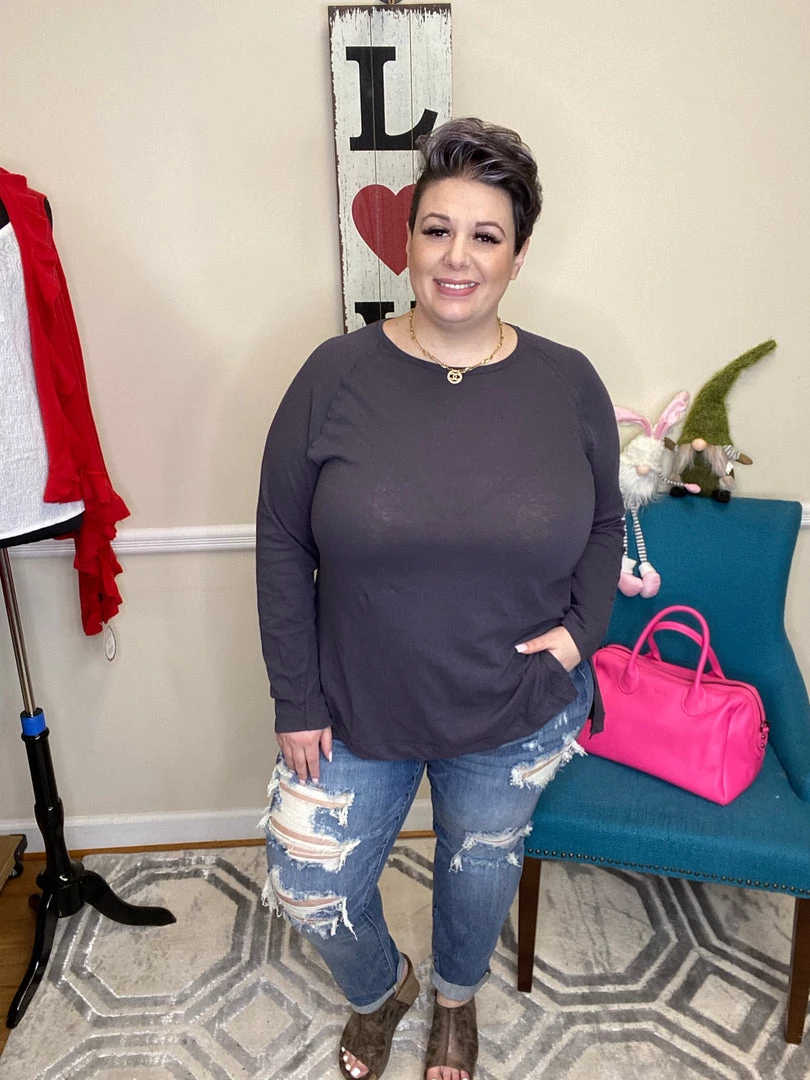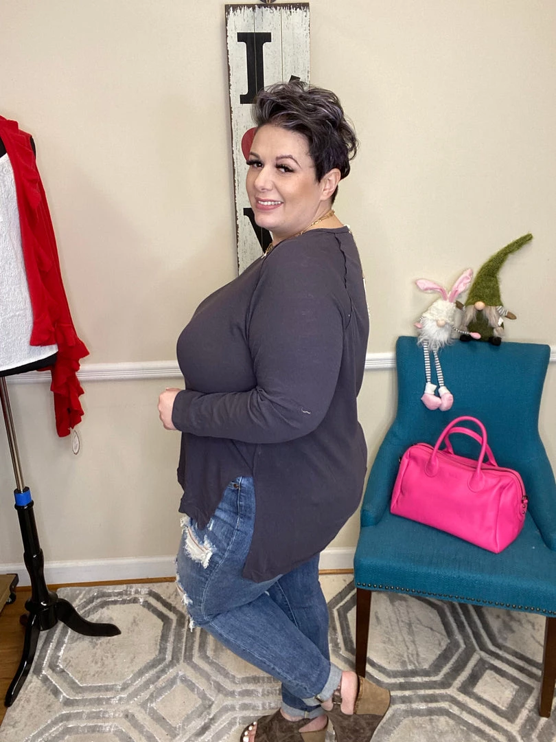This beautiful charcoal gray top is lightweight, soft and simple. This top is easy to pair with anything! With it’s raw seams throughout the top, this shirt is edgy, fun and so chic!