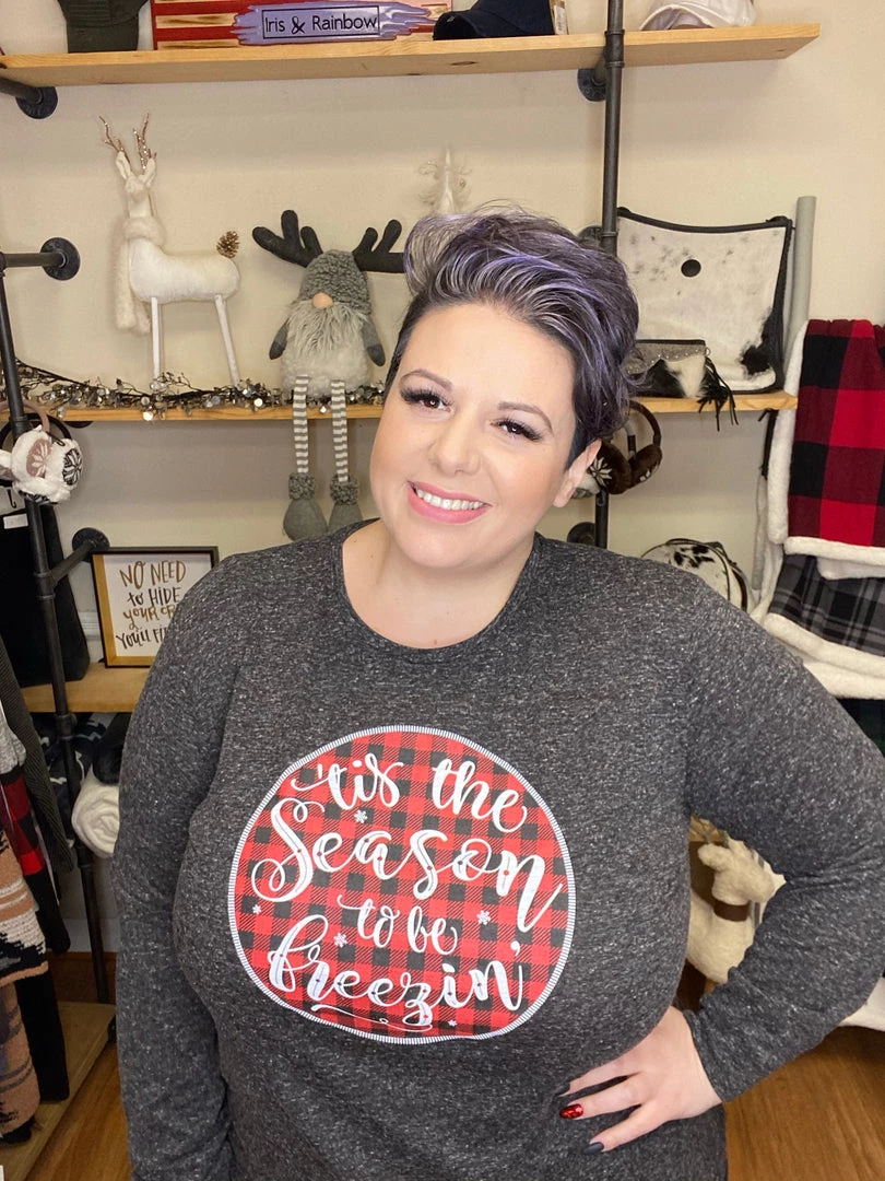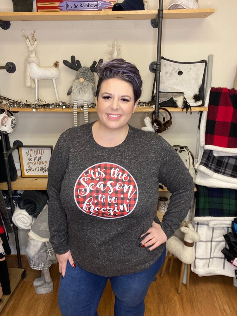 This beautiful super soft t-shirt is long sleeve and has a heathered look to it. The Plaid design says ” Tis The Season To Be Freezin.”