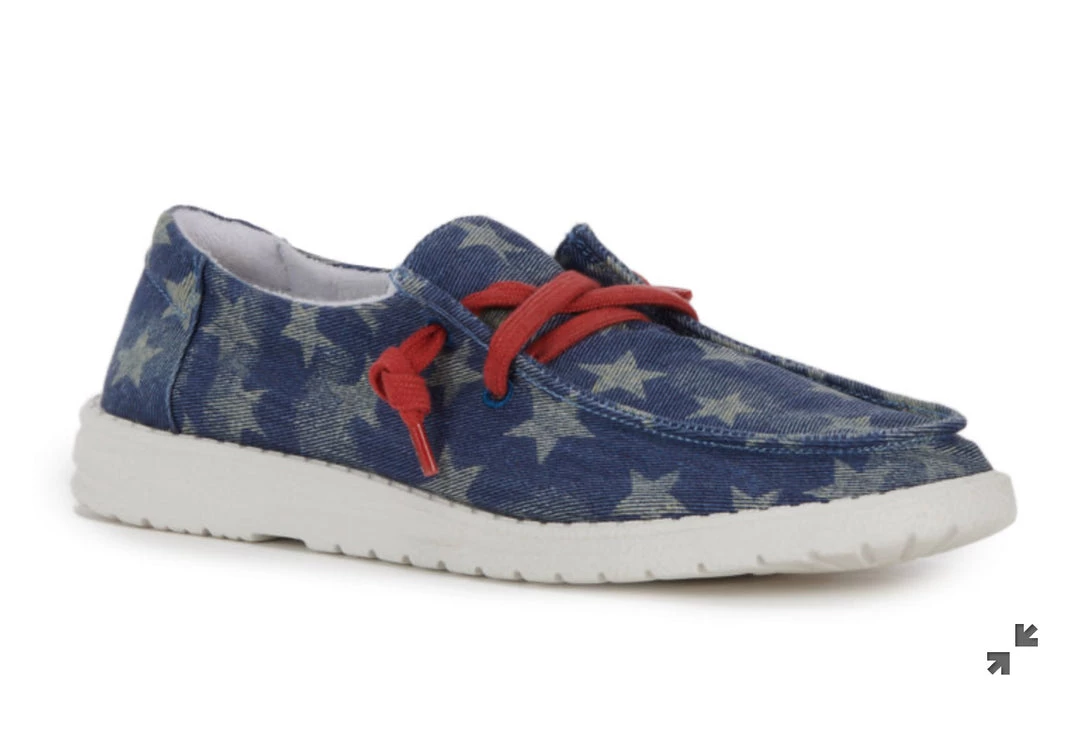 These super cute slip on shoes feature a faded star pattern and red shoe laces! Give yourself that subtle ode to our beautiful flag with the colors and star pattern on these gorgeous shoes! True to size and oh so comfortable, these shoes will definitely become a staple for you!