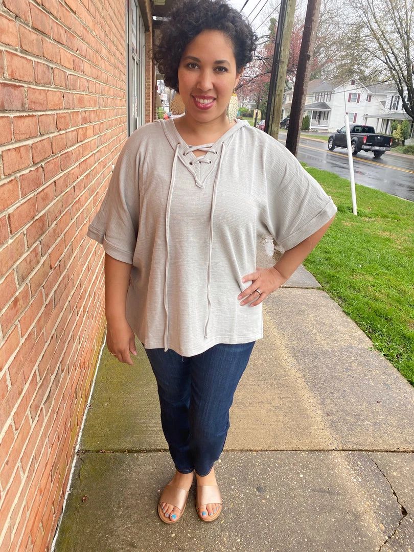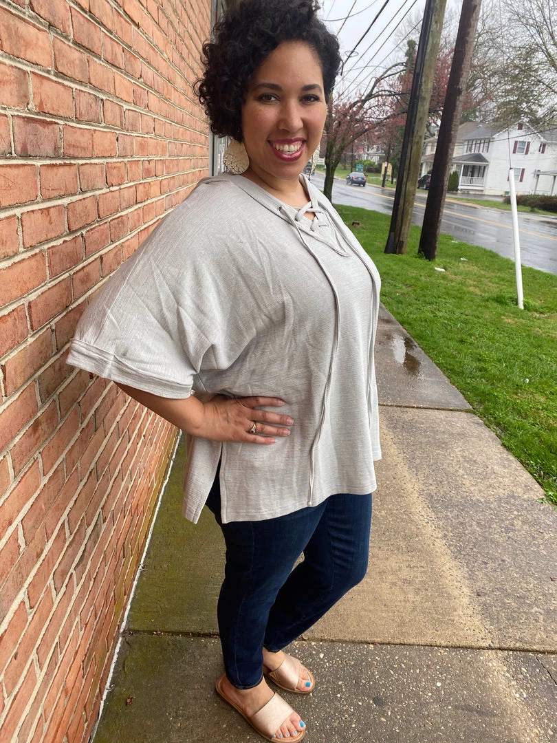 This gorgeous grey hoodie top is perfect for a casual day out! The laces give this a sassy edge. You can wear this with jeans, leggings or shorts!Β
