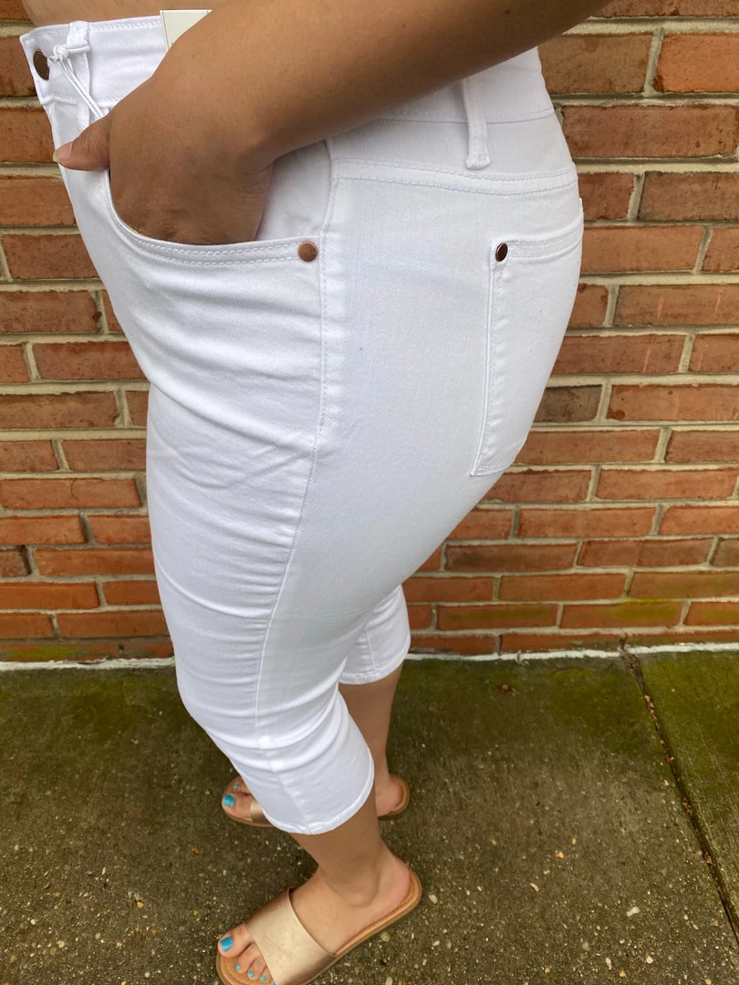 These gorgeous mid rise whiteΒ Judy Blue capris are a must have! The simple and chic look allows these to be dressed up or dressed down. Pair these with your favorite top and shoes for a quick, comfy chic look!