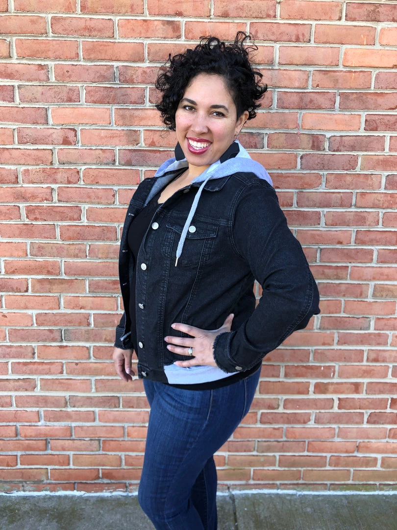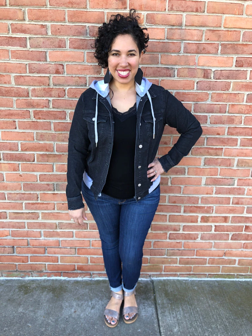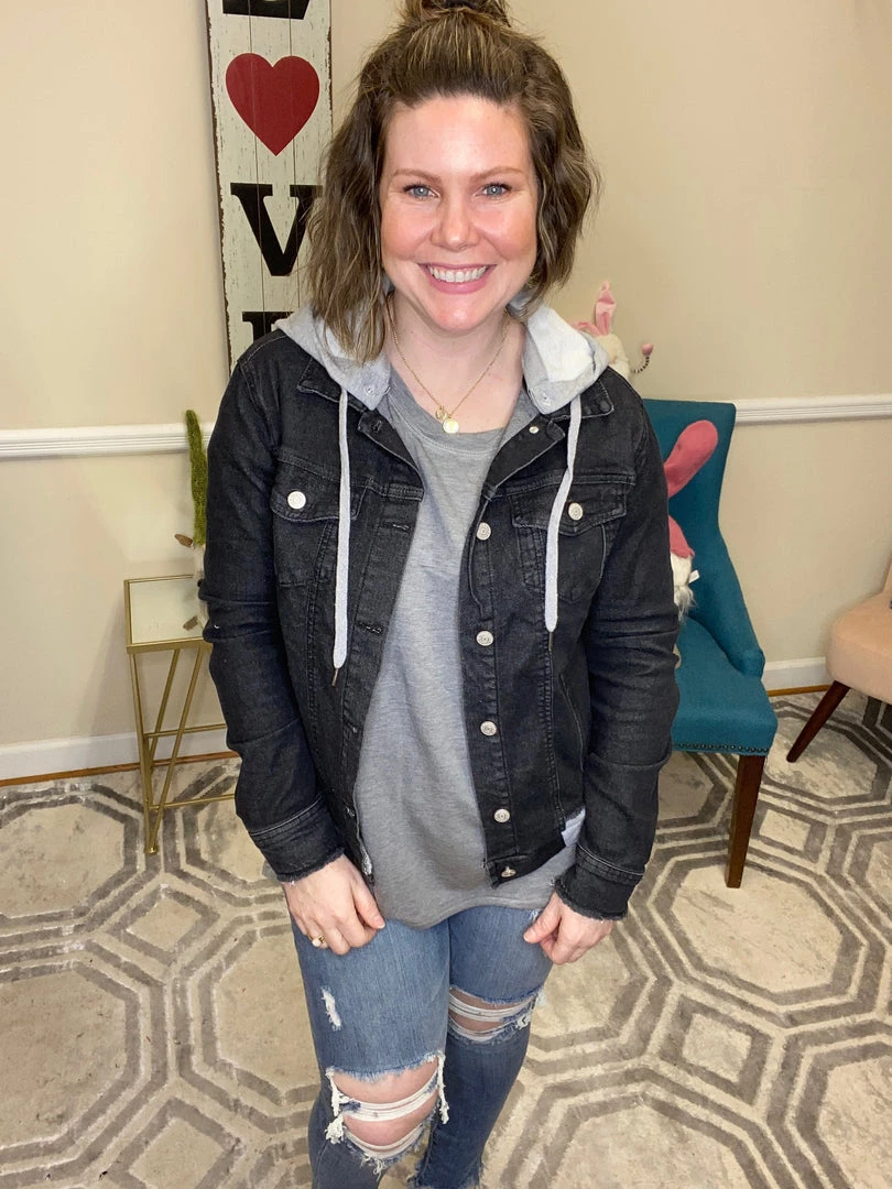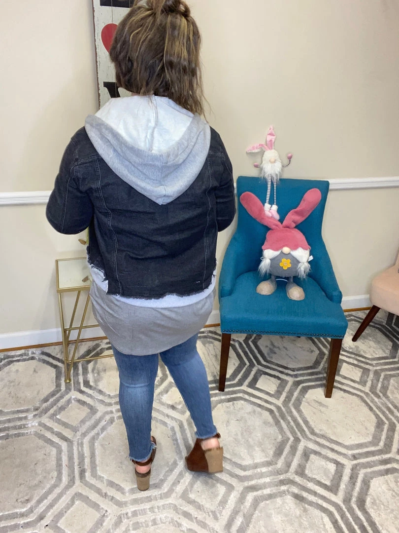 This amazing jean jacket is stunning with distressing on the bottom and a heathered grey hood that detaches. Keep yourself looking on the edge of danger is this gorgeous jean jacket!