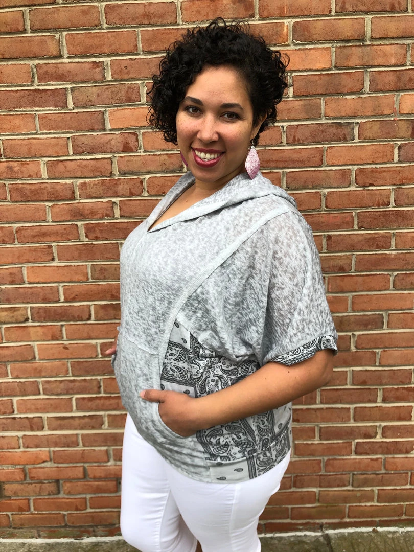This is a Pol lightweight summer sweater, we recommend sizing down. Iris is 2XL and she wears L in this top.Β