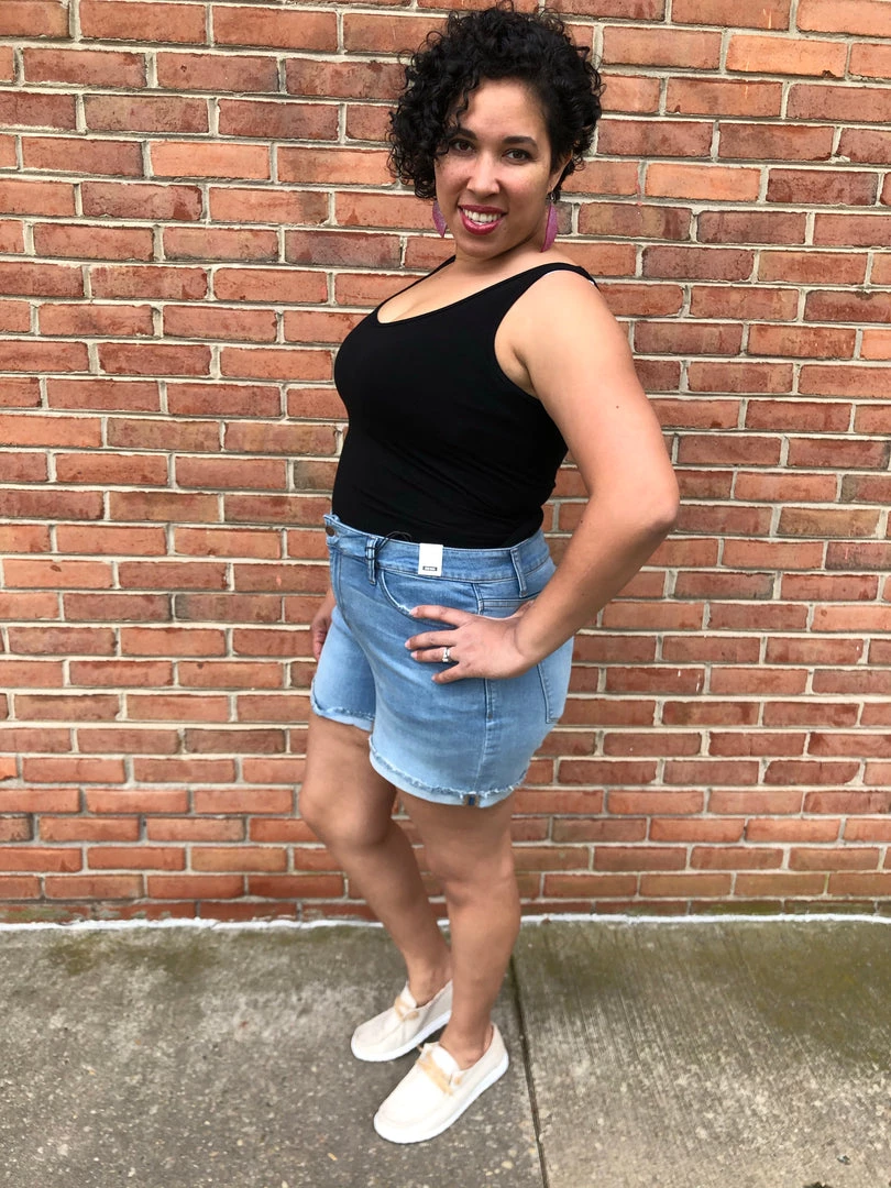 These amazing mid-rise shorts are incredible! They gorgeousย light wash makes these the perfect casual non-distressed summer shorts to pair with any top! These comfy shorts are perfect to take on vacation or just to lounge around in!