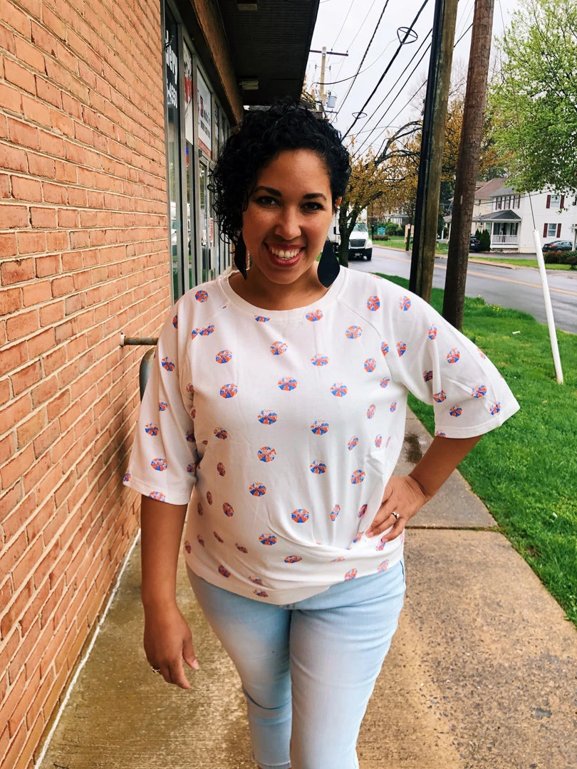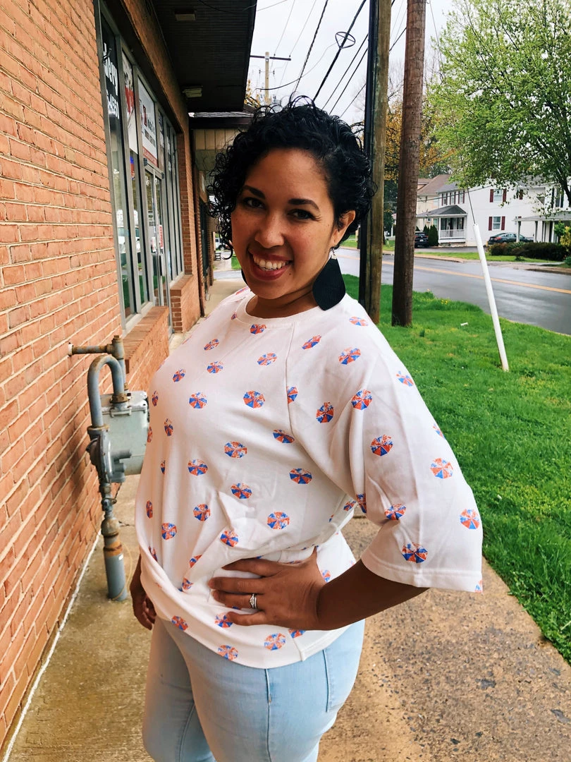 This gorgeous top features red and blue umbrellas on it in a fun print! You will love the flattering cut of this gorgeous top!