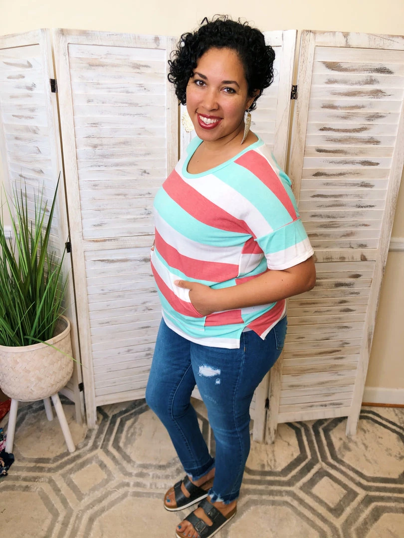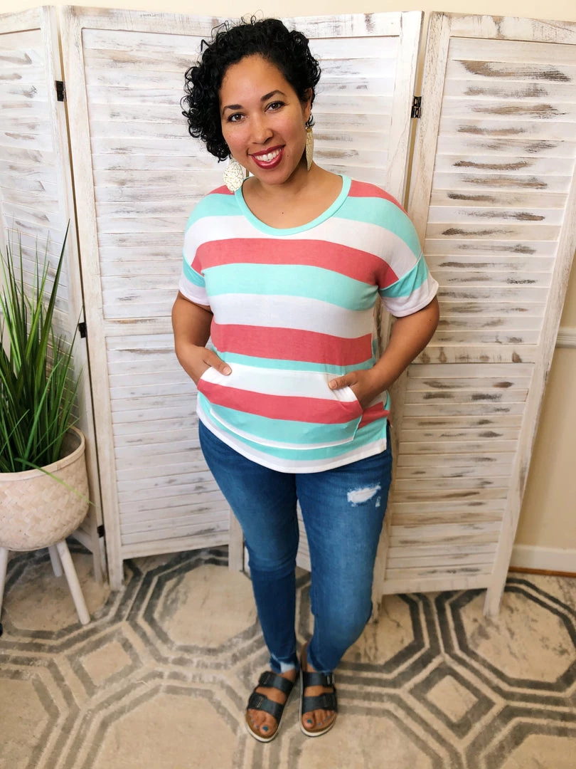 This gorgeous green,ivory and coral striped shirt is so lightweight and perfect for Spring & Summer. Pair this top with your favorite bottoms for super cute summery look!Β