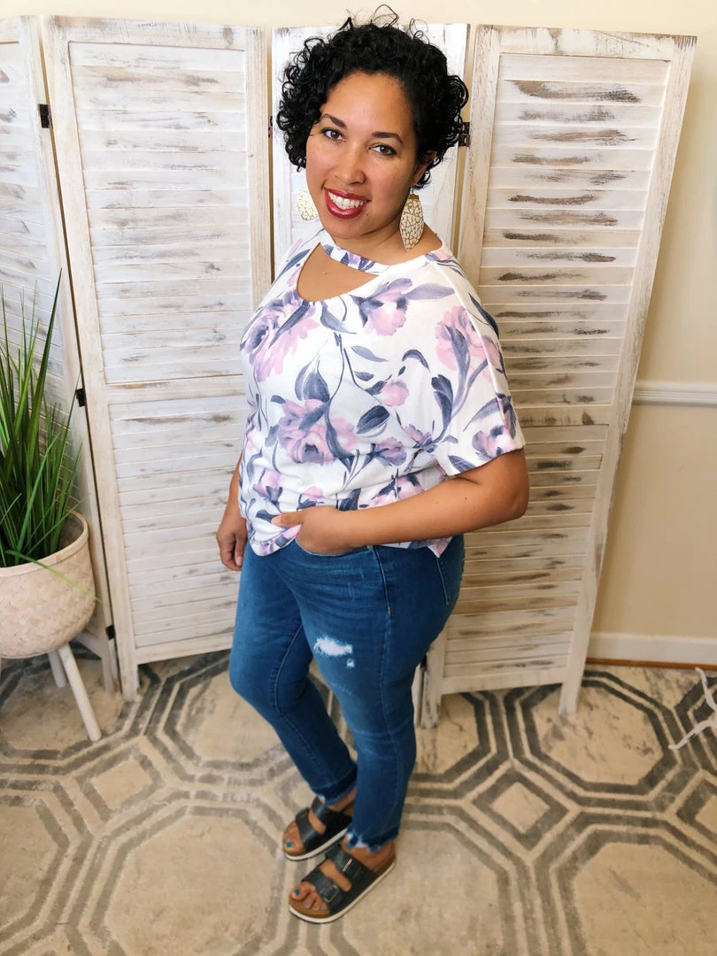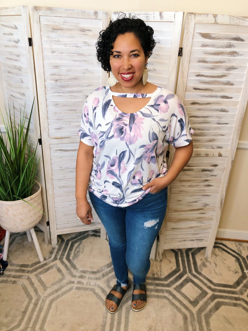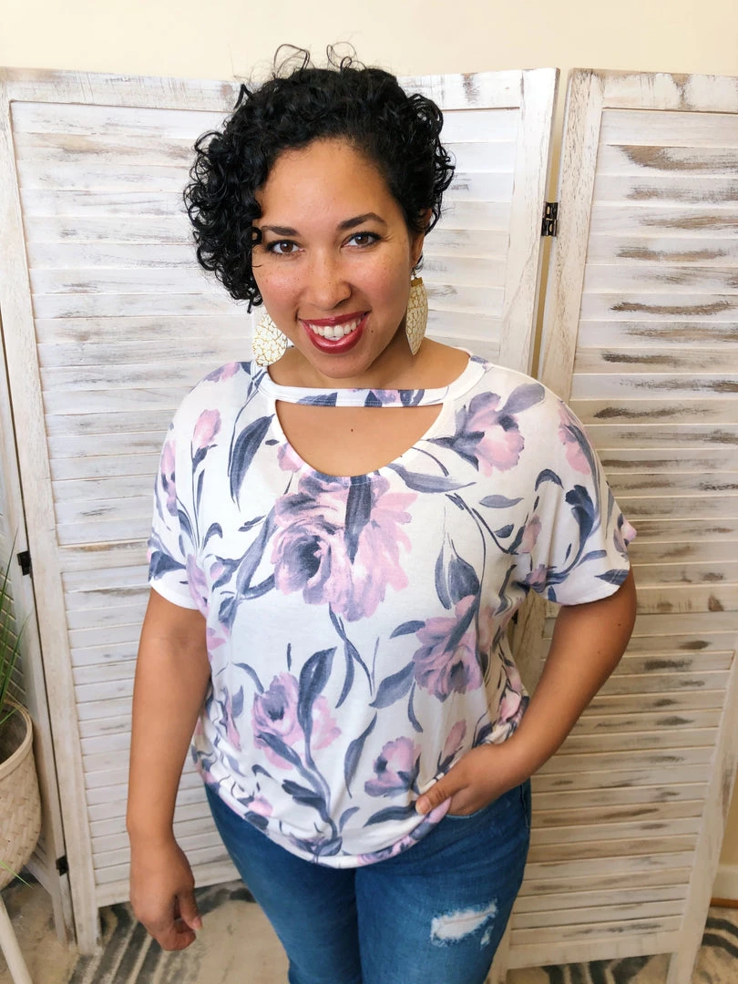 This stunning top features light pink flowers that are so delicate, they look like a watercolor painting! You will love pairing this beautiful top with your favorite bottoms.