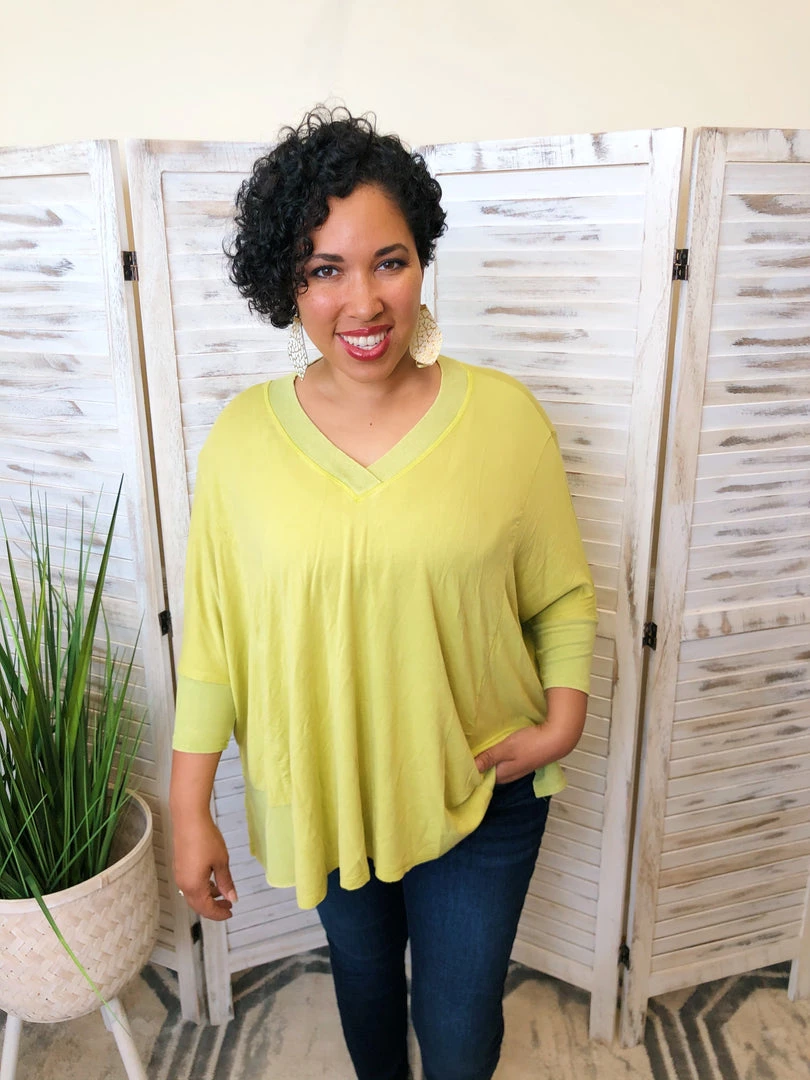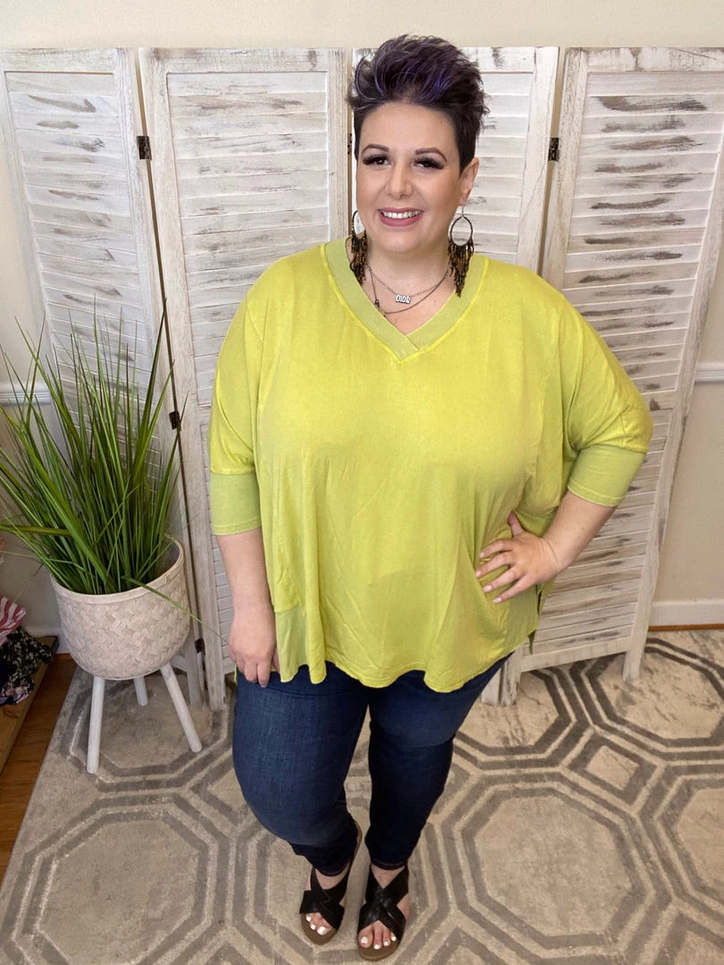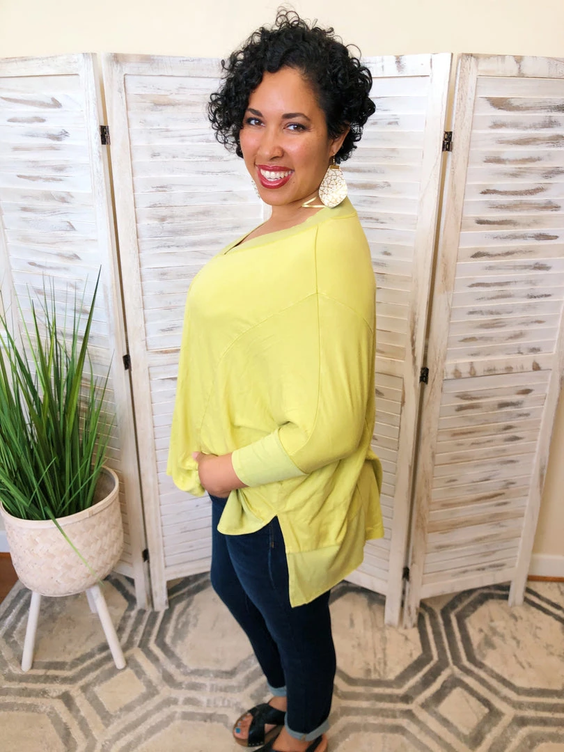 This gorgeous mineral washed top features a poncho like cut that is super flattering. You will love pairing this oversized v-neck top with your favorite bottom for a comfortable outfit that can easily be dressed up or down!