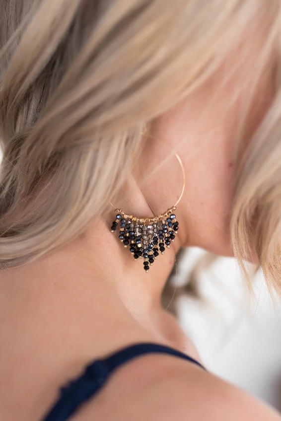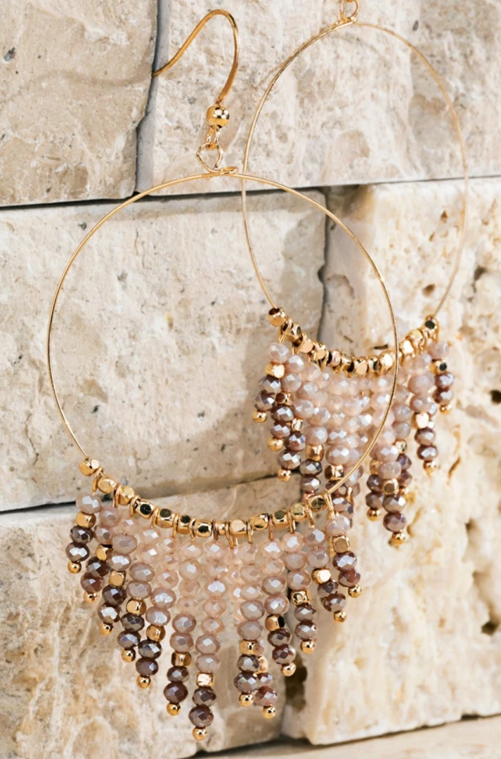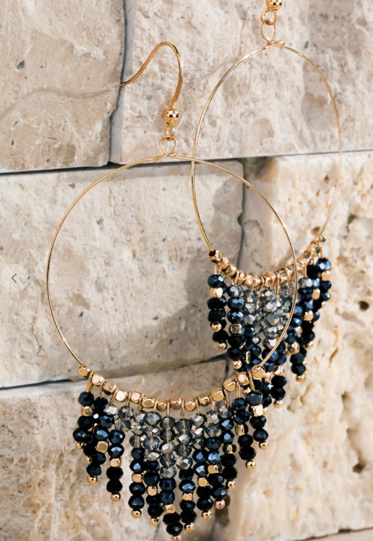 These gorgeous chandelier hoop earrings feature a fish hook backing and breath taking glass beads. These lightweight earrings will dazzle while going easy on your ears so you can wear them all day and night without even feeling them!