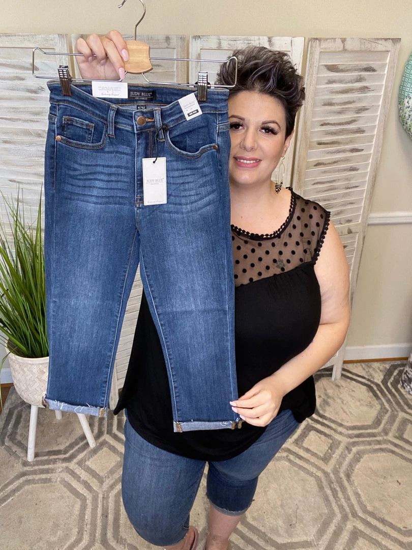 Theseย amazing mid rise Judy Blue capris feature a cuffed raw hem that can easily be uncuffed for a longer length! These non-distressed capris are dark wash and super stretchy.