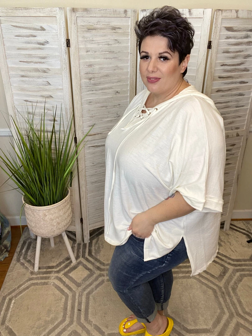 This hoodie runs big. Iris is a trueΒ 18W/2XL. Iris wears a 1XL in this top.