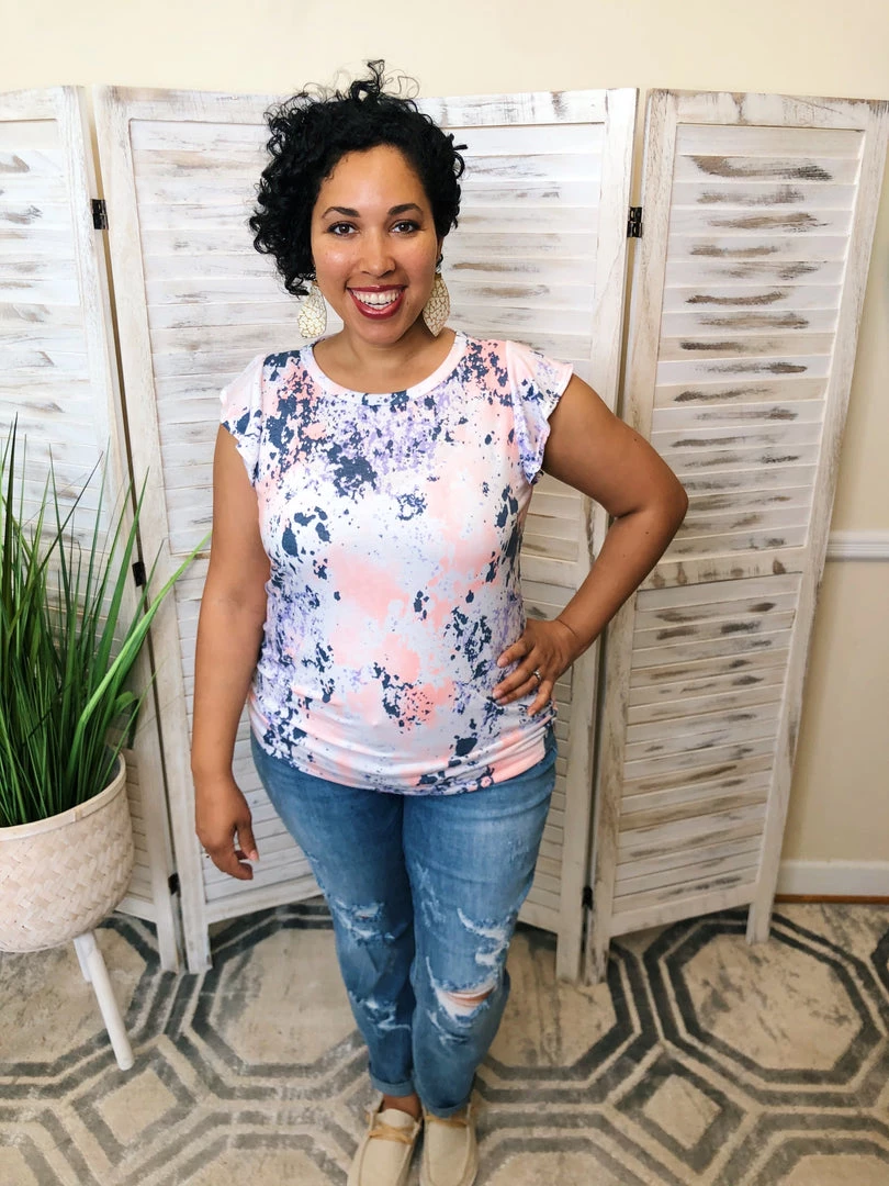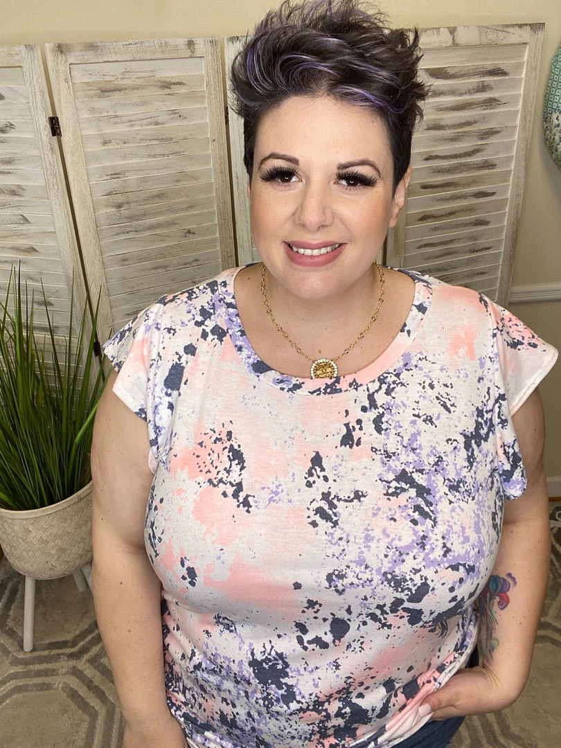 This gorgeous top features a splatter of peach-pink, purple and black. This scoop neck shirt is lightweight and so cute! Pair this gorgeous top with your favorite bottoms for a top that will let your adventurous spirit soar!