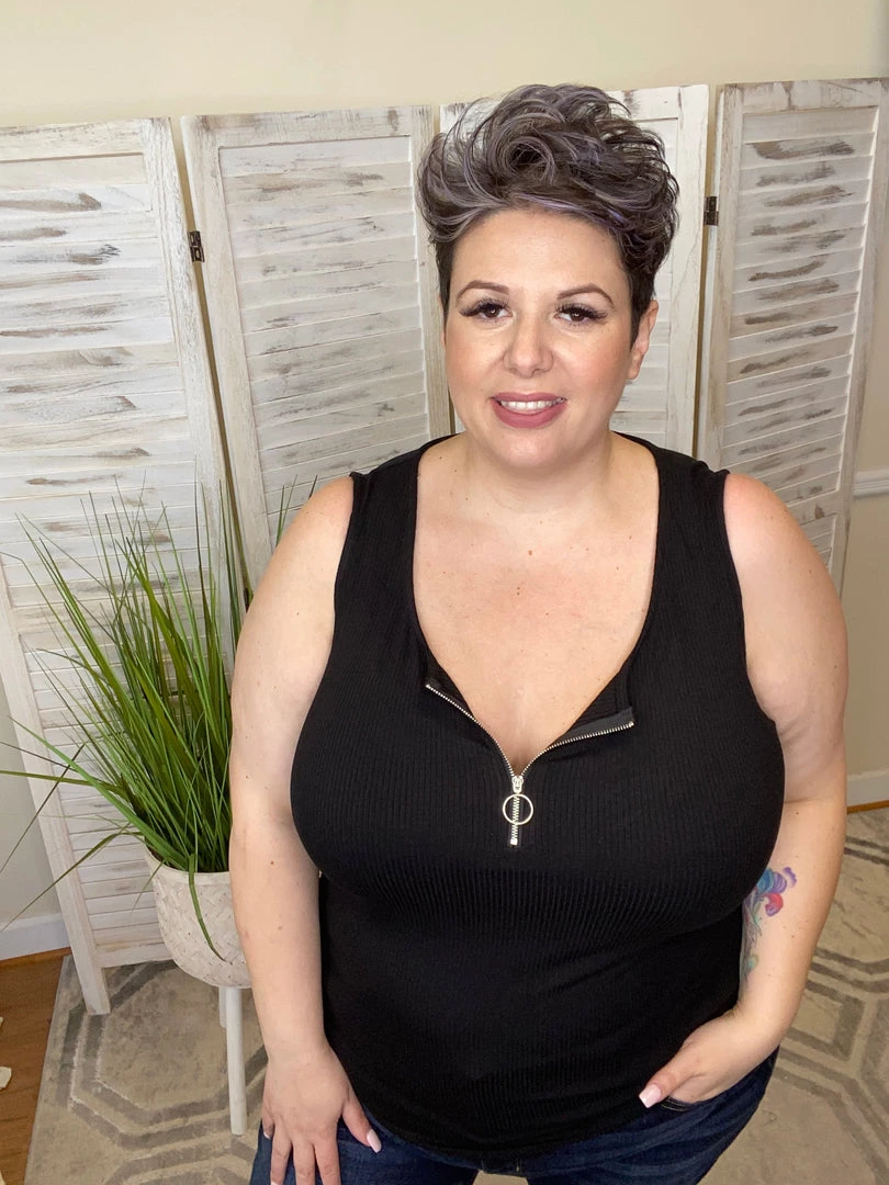 This stunning tank top has ribbed detailing and a silver half zipper on the front. Layer this top or wear as is, you can’t go wrong with a simple tank top in your wardrobe!