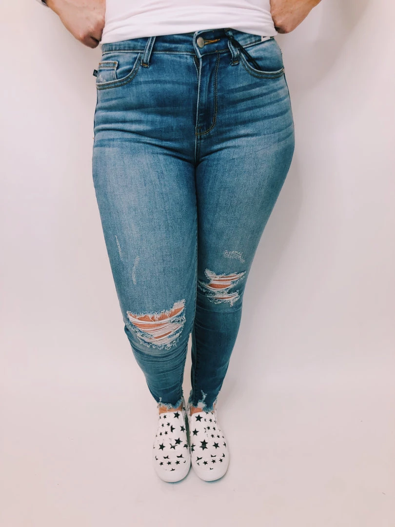 These amazing lightly distressed medium wash -high waisted-,skinnyΒ fit Judy Blue jeans have amazing stretch. You will love pairing these versatile jeans with any outfit! The light distressing on this makes this an easy pair of jeans to dress up or dress down.