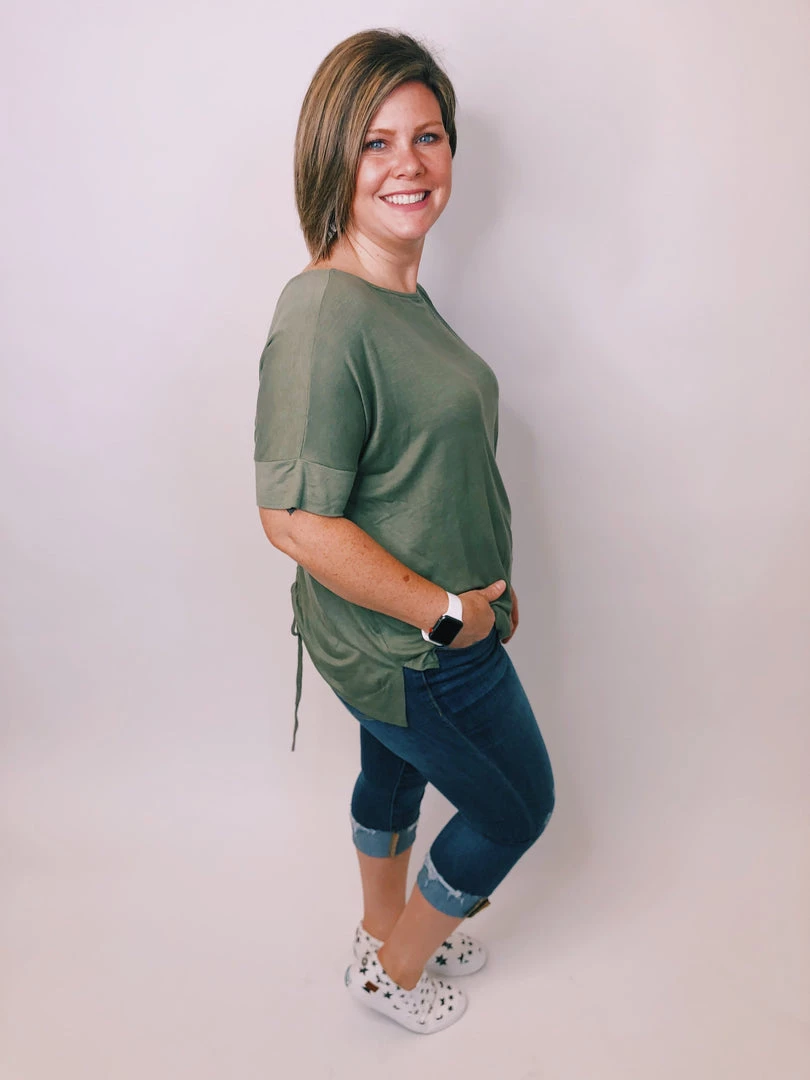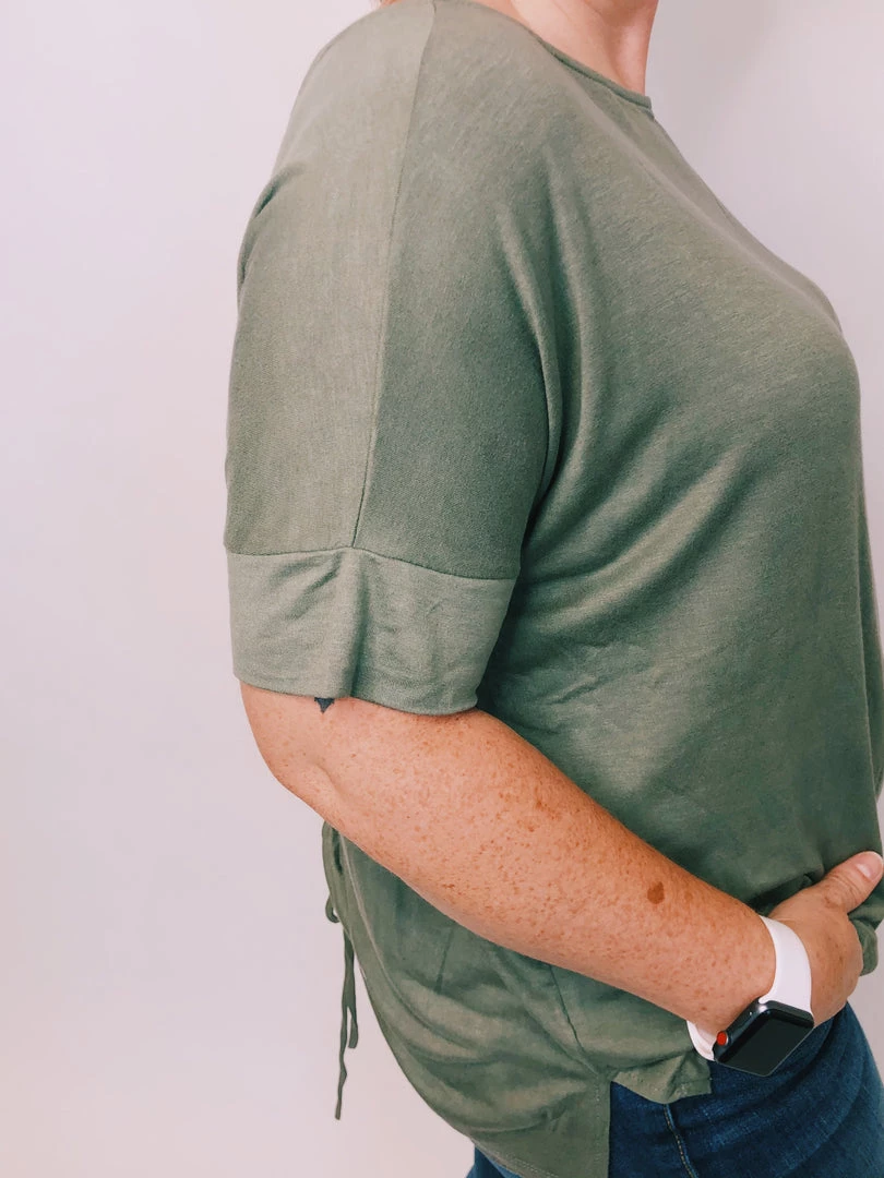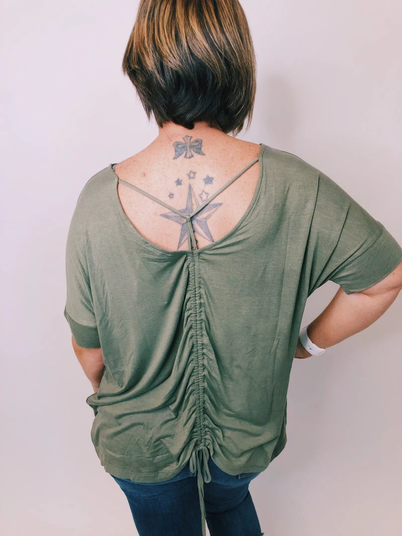 This solid loose-fit knit top feature a ruche v back and a cute string detail. It will be perfect to match with leggings, shorts or your favorite bottoms.