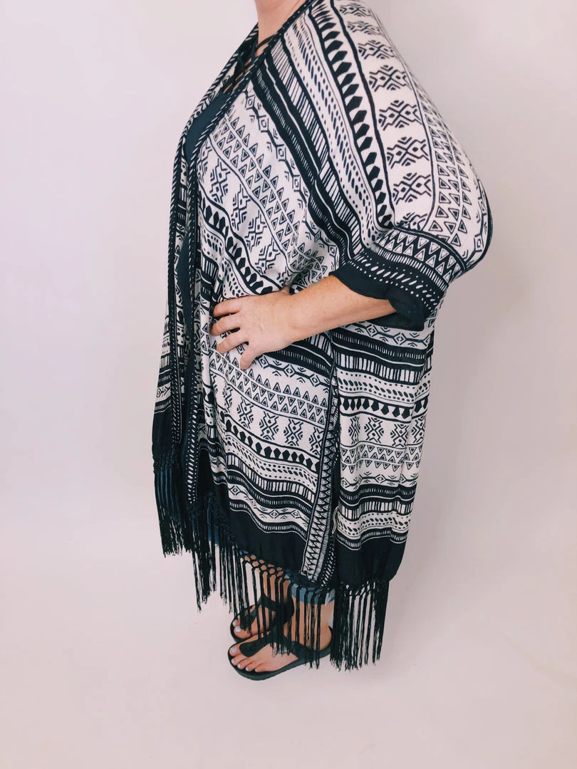 This breathtaking kimono with it’s intricate design and chic tassels at the bottom give this cover up an edgy chic look that pairs well with a casual outfit or as a swimsuit cover up. Add this sophisticated kimono to your wardrobe for an effortlessly chic outfit staple!