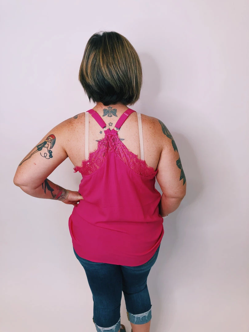 This stunning lace trim cami is so sexy! Pair this with your favorite cardigan or wear it as is- this show stopping top is an absolute must have.