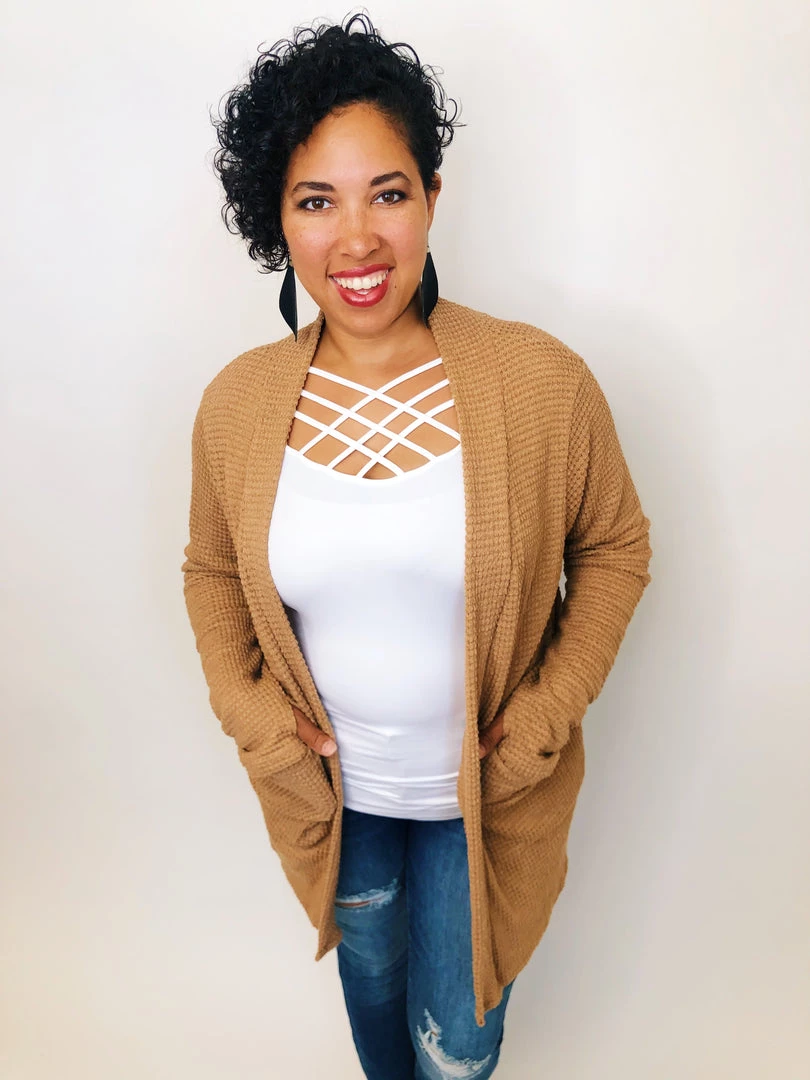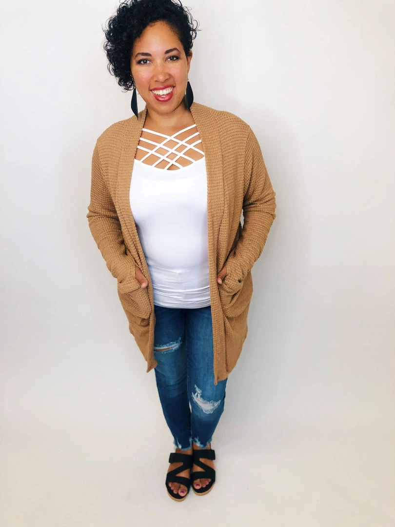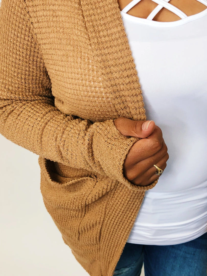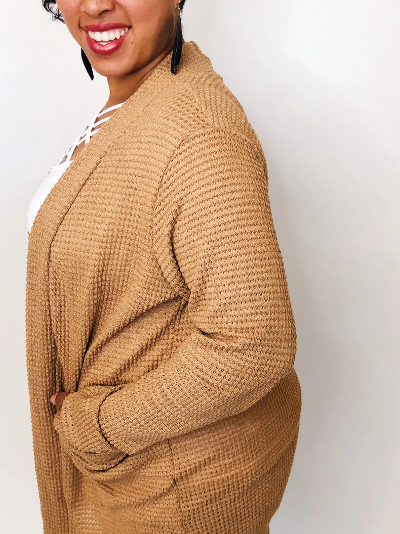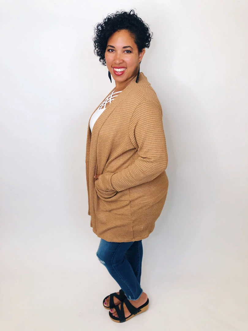 This gorgeous waffle knit cardigan is aΒ deep tan color and is so soft! This cardigan also has pockets on both sides of the open front. Pair thisΒ with your favorite top and bottoms for a super cute, comfy outfit that is sure to make any day great!