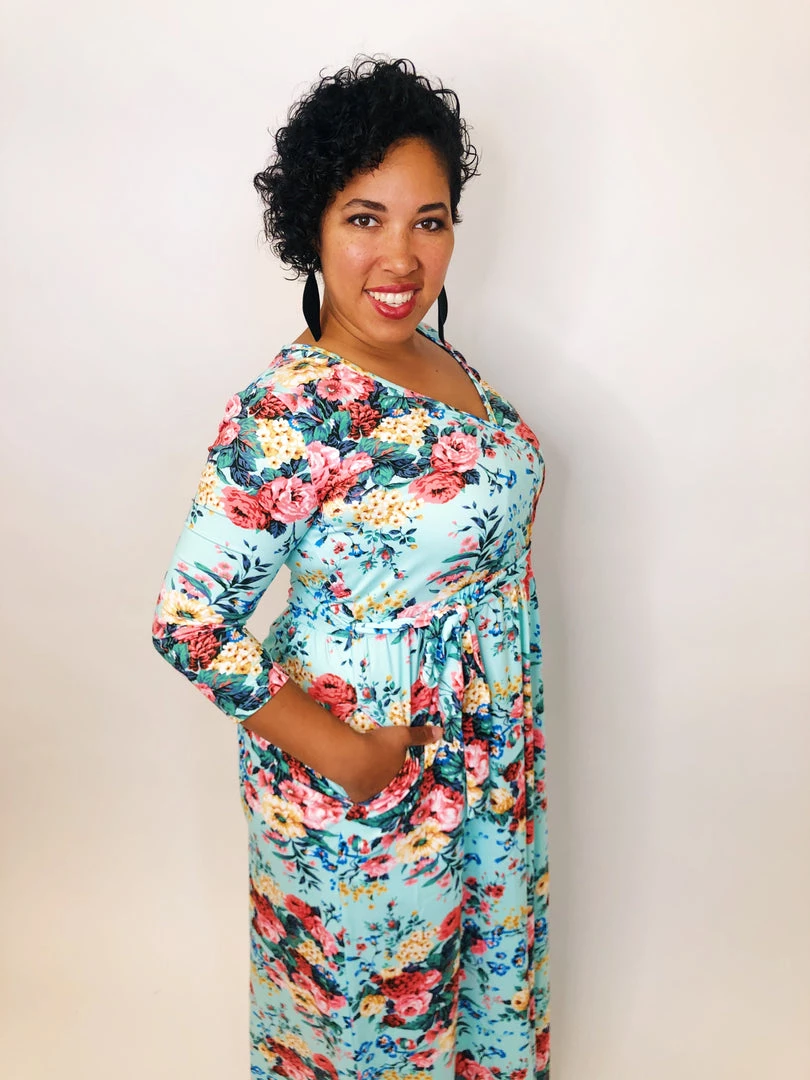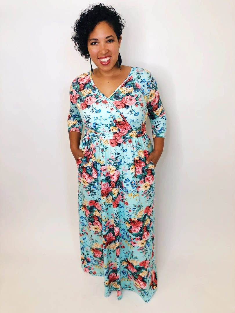 This gorgeous floral maxi dress features a faux wrap design, 3/4 sleeves and a tie to help achieve the perfect fit! This super soft dress is a buttery soft leggings material and can easily be dressed up or dressed down for any occasion.