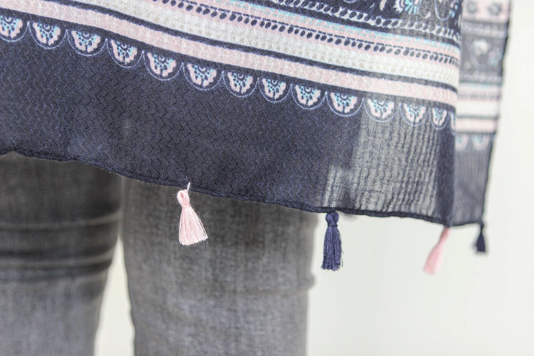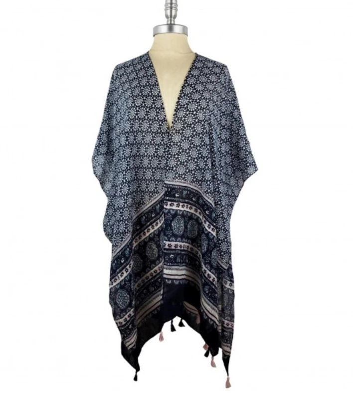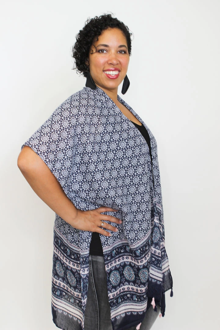 This stunning kimono features intricate designs that will remind you of an exotic vacation. Take a vacation every time you wear this kimono by pairing it with your favorite swimsuit or with your every day outfit!