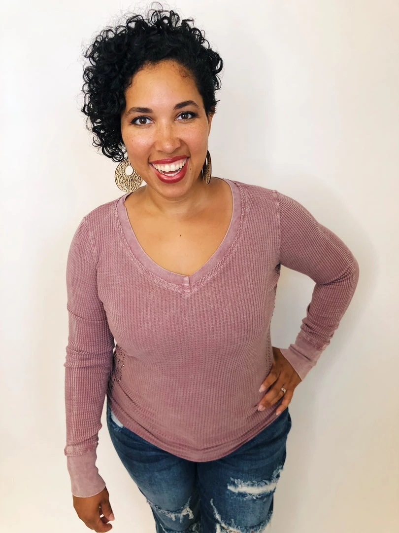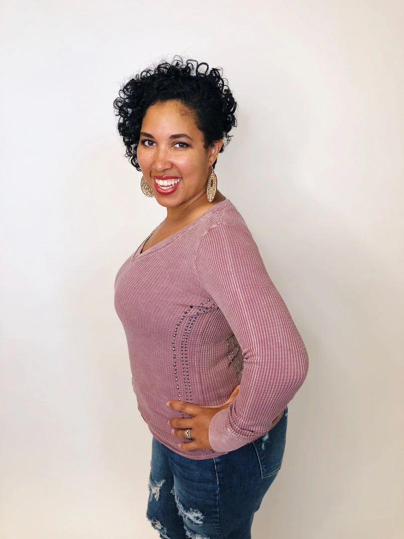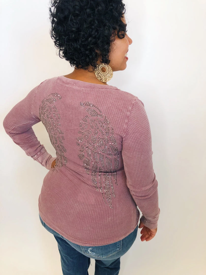 This stunning mauve top featuresย crystal studded sides and gorgeous angel wings on the back. This v-neck, waffle knit top has amazing stretch and a raw edge design. Pair this gorgeous top with your favorite bottoms for an edgy chic look.