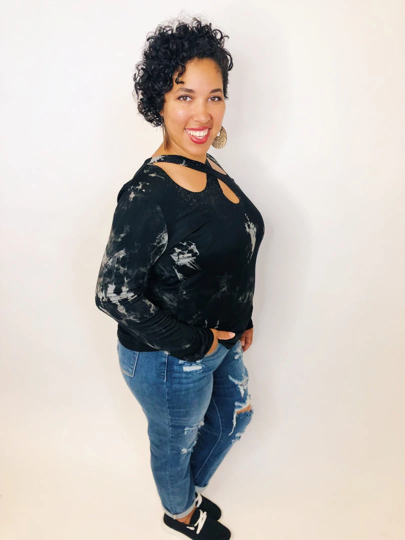 This is such an amazing and different long sleeve top. It is really soft and the shinny open detail in the front it’s just gorgeous. You can pair this top with your favorite leggings or bottoms.
