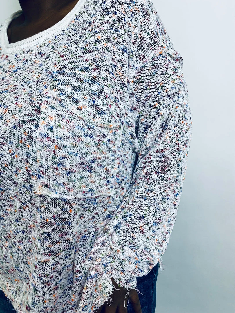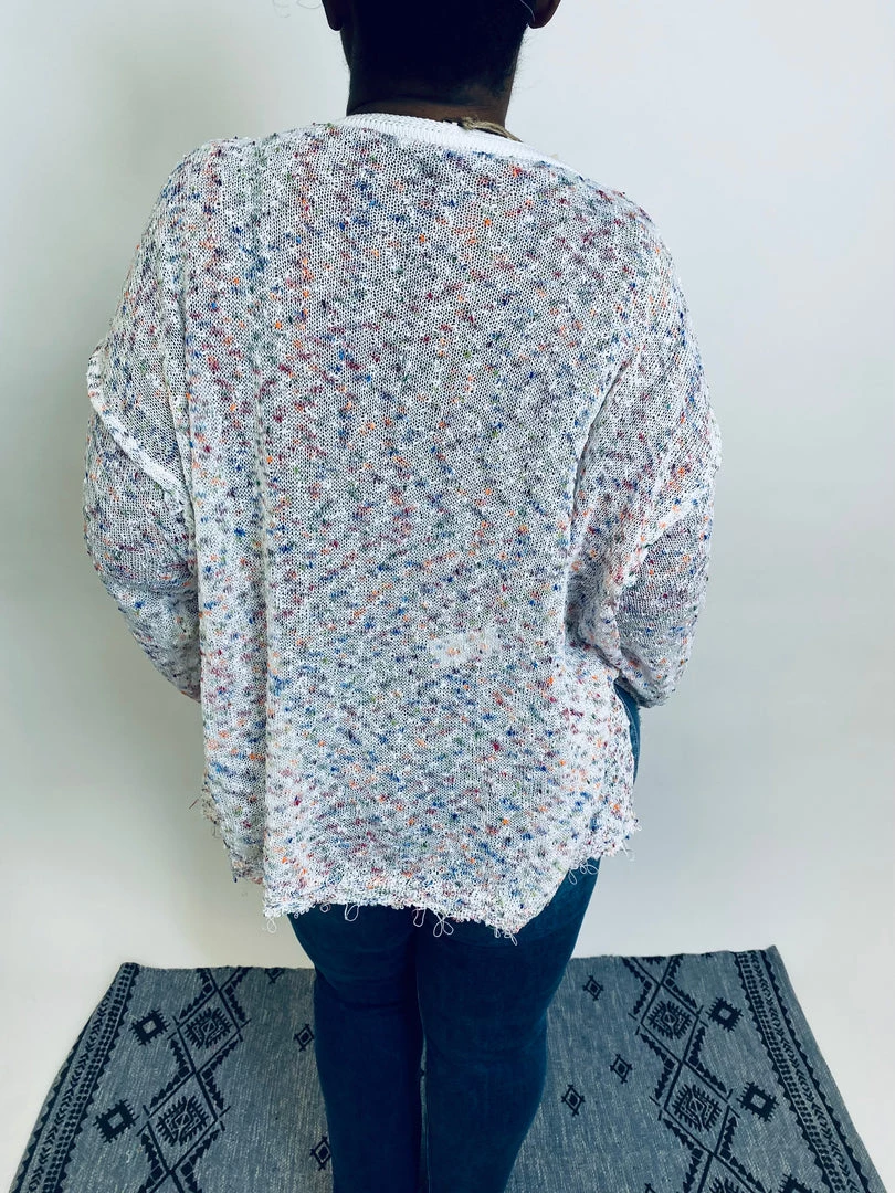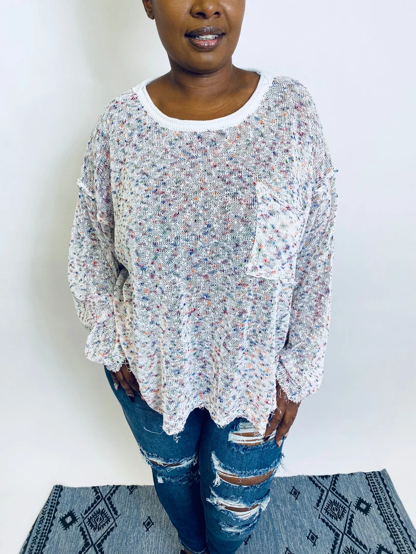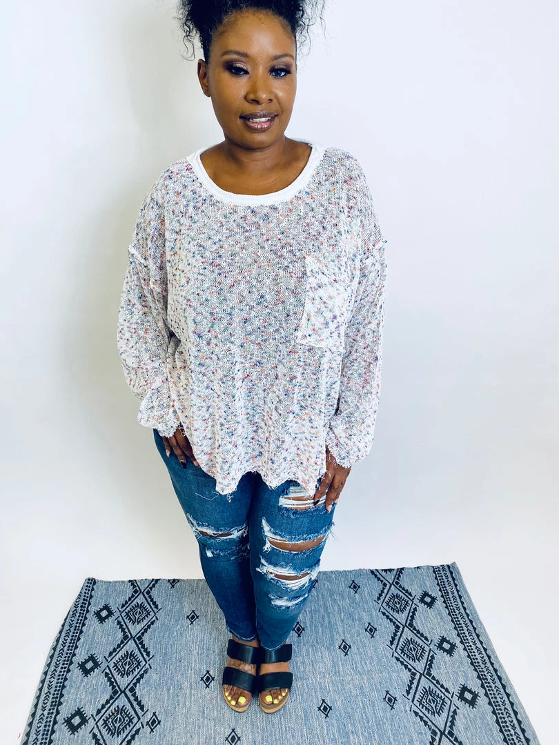 This adorable sweater has fun colors and a soft crew neck. The side slits give this super cute sweater a lot of movement and the raw hem adds the final edgy touch to this otherwise cutesy sweater! You can pair this sweater with shorts, leggings or your favorite bottoms and go enjoy the breeze days.