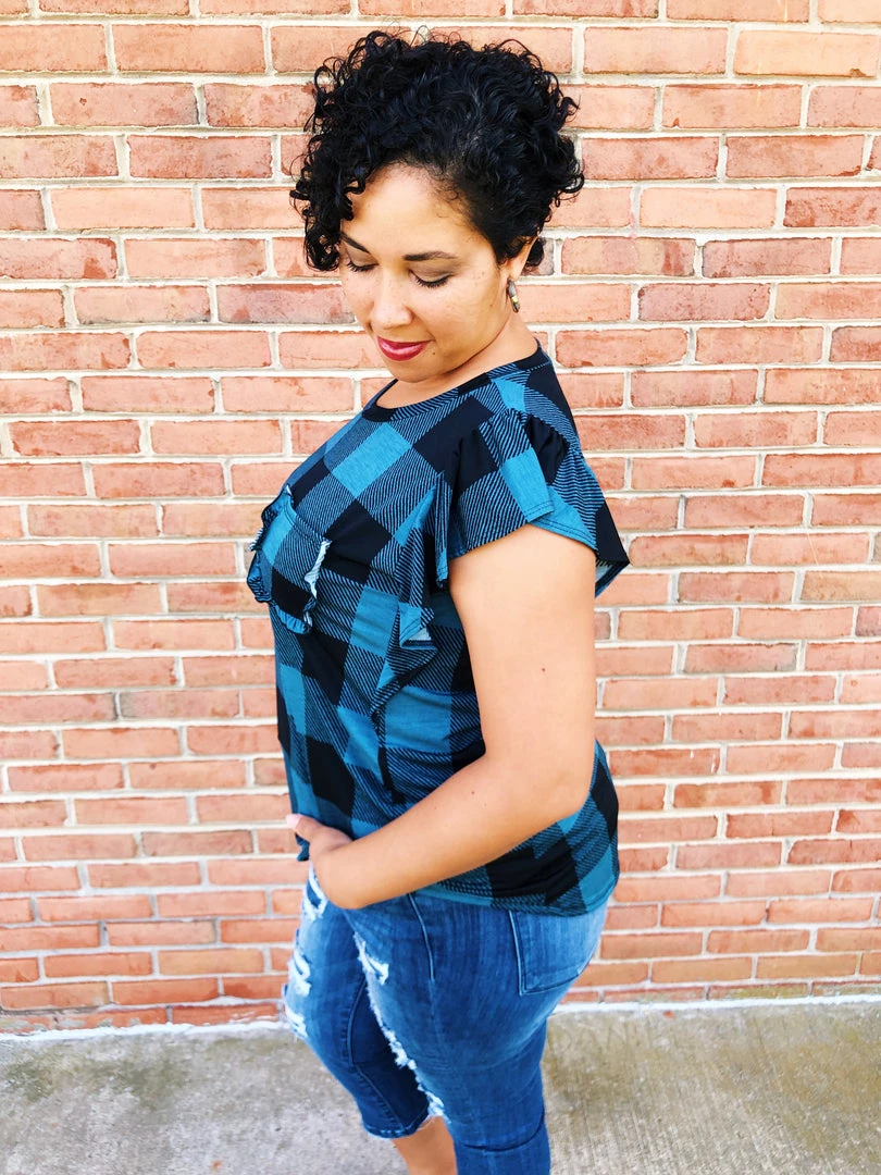 This is a really soft plaid top. It features ruffles details around the sleeves and the pocket that gives this top a nice flow. The colors teal and black are so cute together and you can pair this top with shorts, leggings or your favorite bottoms.