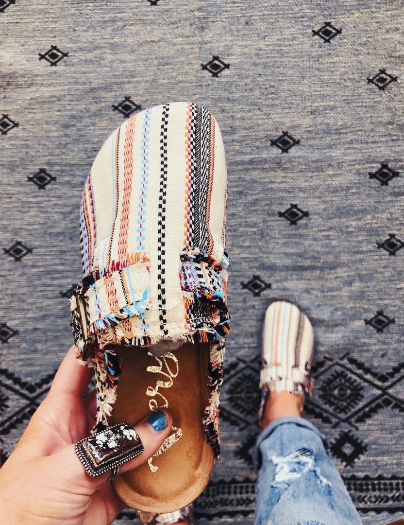 The gorgeous cream color with the aztec warm details, plus the frayed distressed look make these super comfortable slip on shoes something you will absolutely need.