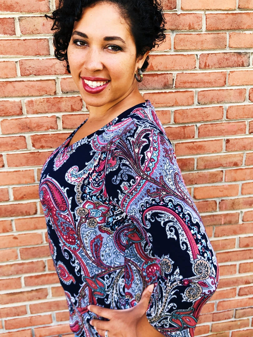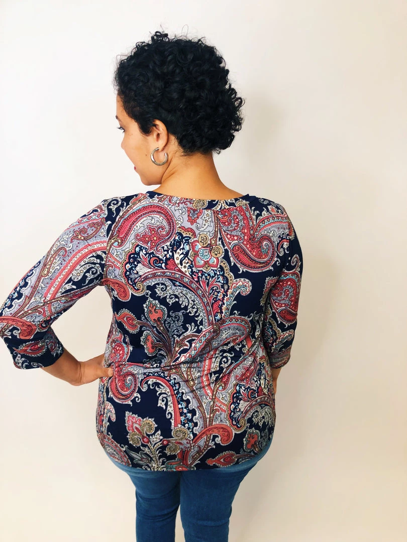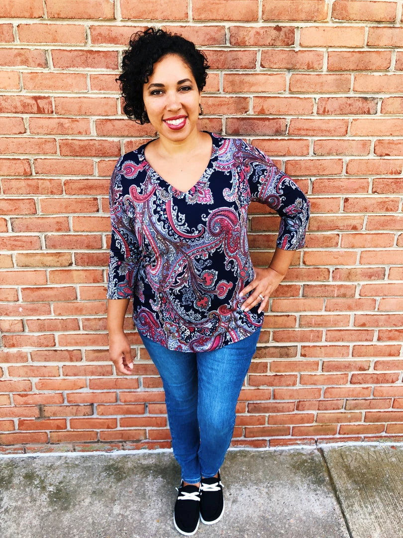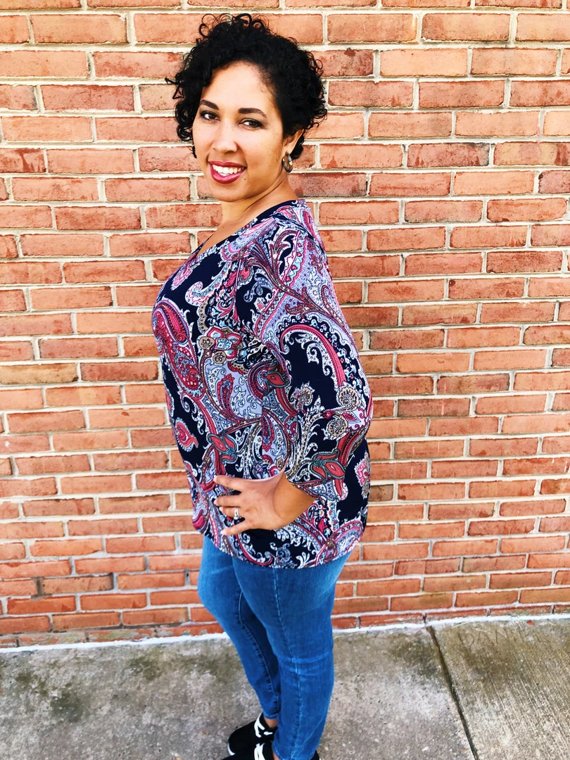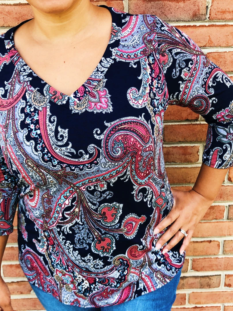 This gorgeous paisley top features 3/4 quarter sleeves, amazing stretch and a v-neck. It is lightweight and the paisley designs consist of deep reds, greens and ivory. This top can easily be dressed up or dressed down to be used for multiple occasions! The colors make this a great transition piece for the seasons. Snag this to be effortlessly chic for the cooler months!