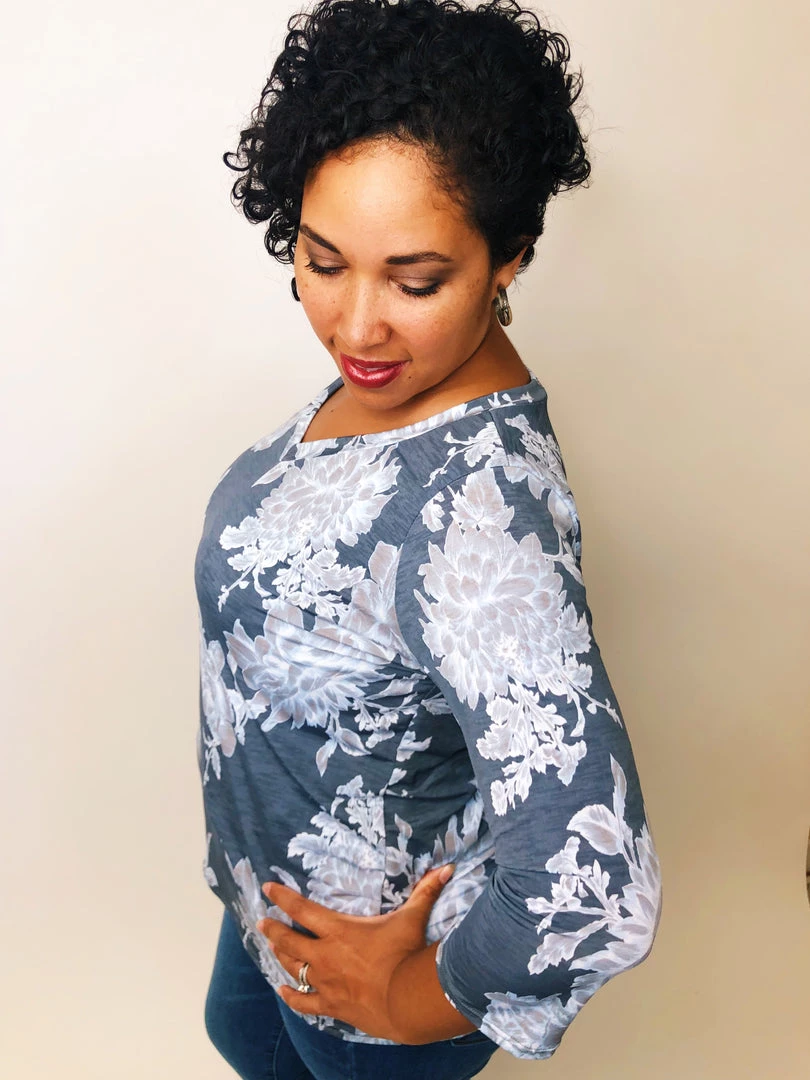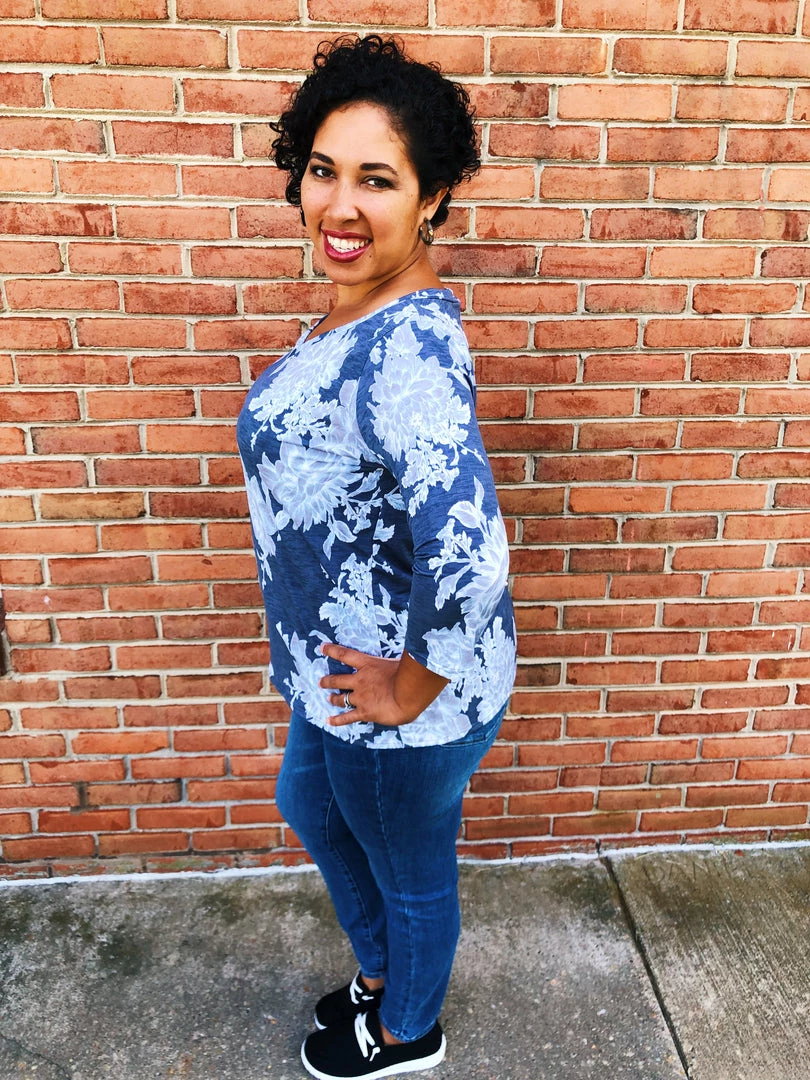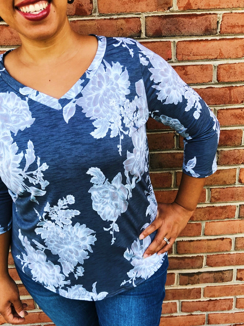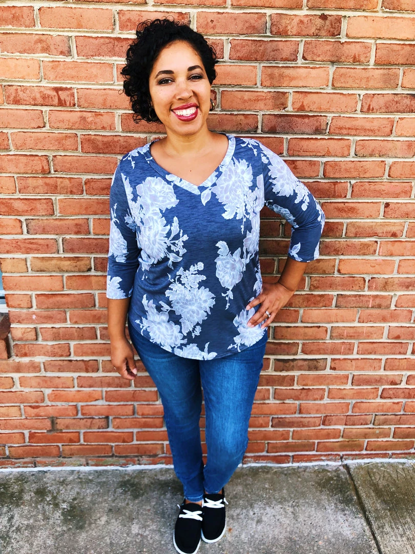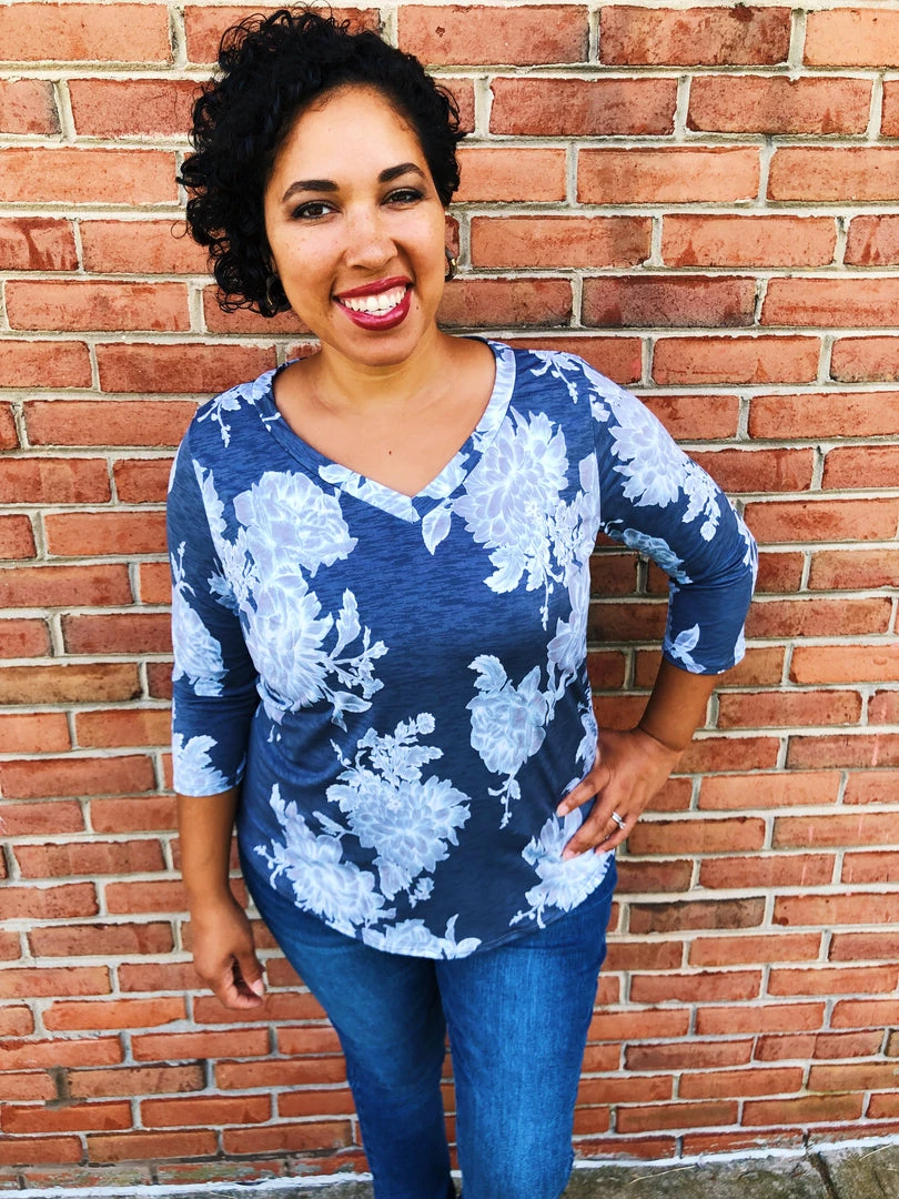 This gorgeous lightweight top features fluorescent flowers on it with a blue-grey background. This v-neck top features 3/4 quarter sleeves and longer length making this the perfect casual or dressy top. Snag this effortlessly chic floral top and wear it for all your favorite moments!