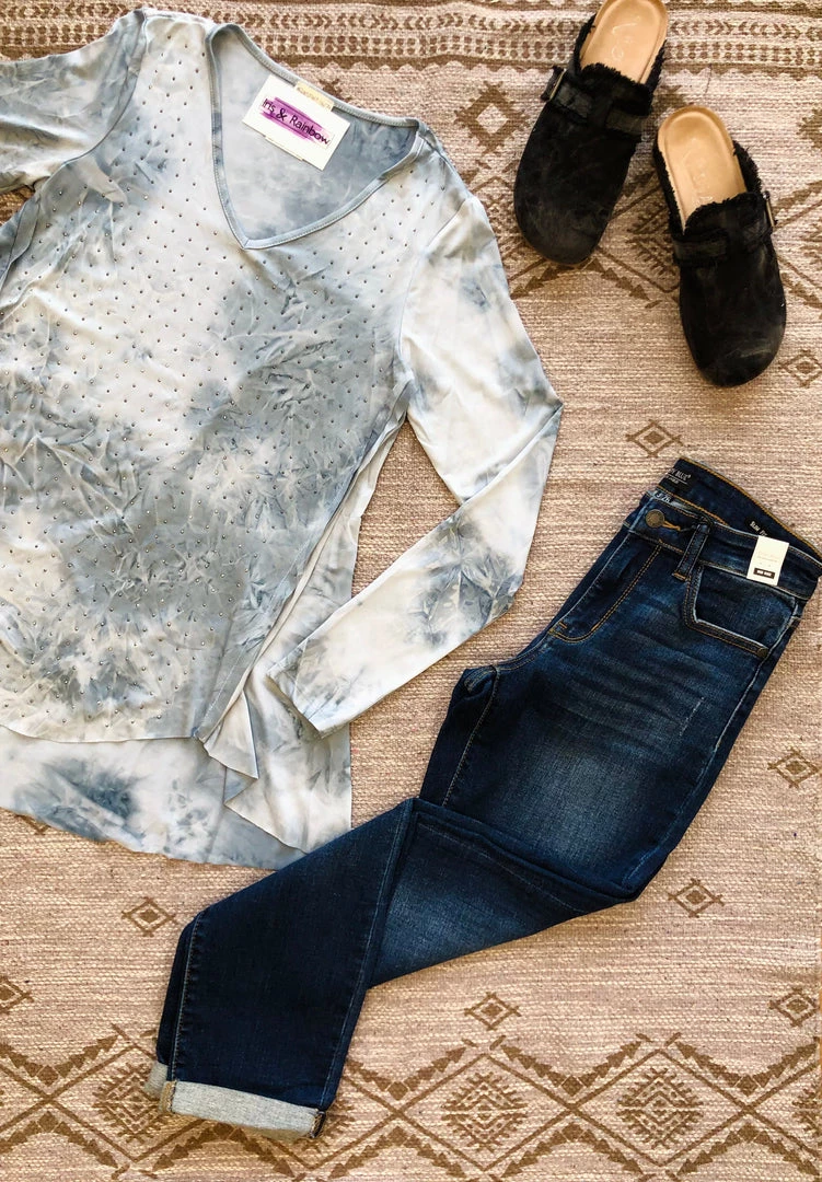 For those who love tie dye plus stones tops, your moment it’s now!! This is such a soft long sleeve top with a nice V-neck. The blue tie dye color makes this top looks s cute and versatile. It also features some cute stones all over the front. The style of high low top and the raw hem gives a nice flow. You can pair this top with shorts, leggings or your favorite bottoms. You will look amazing, believe us!!
