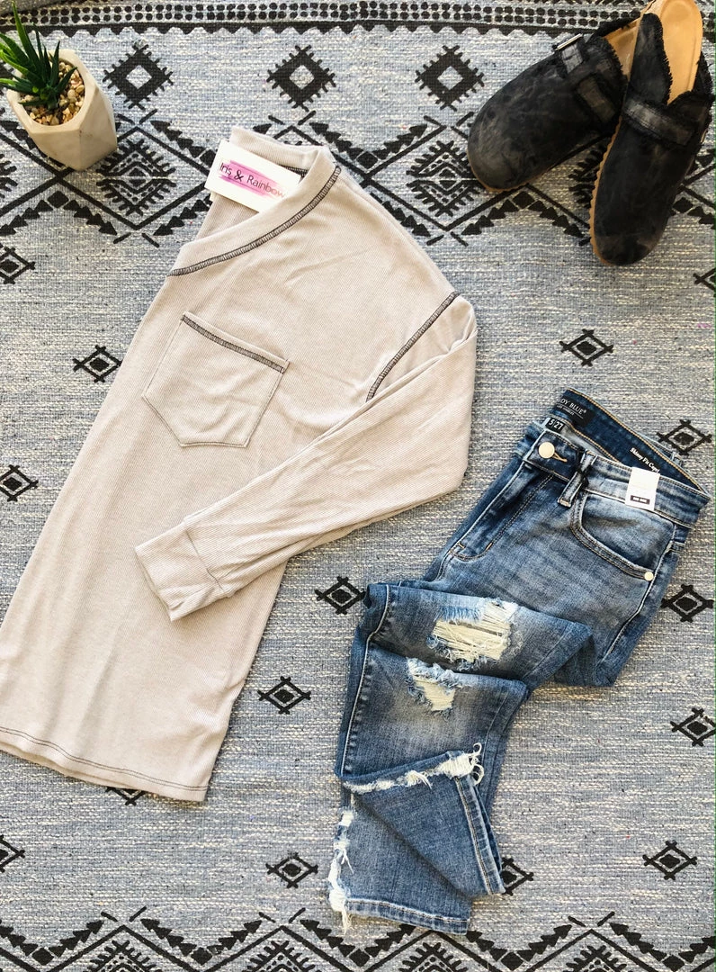 This beautiful ribbed v-neck sweater features a grey background with black thread on the hem lines. The ribbed pocket also has black thread at the top to give the pocket an extra pop! This long sleeve sweater has incredible stretch!