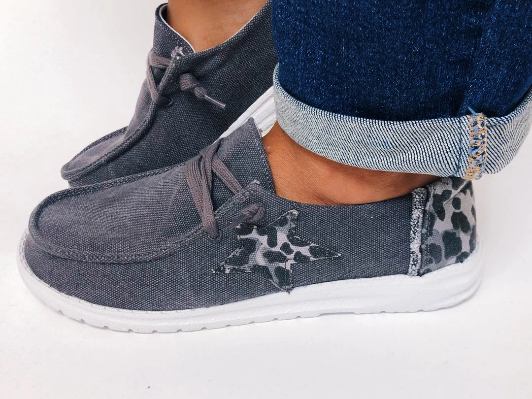 This amazing Gypsy Jazz slip on shoes are a grey canvas material with a gray lace design that can easily be tied to make these shoes tighter if you have narrow feet. The side of the shoe has one grey leopard print star on it. The back of the shoes is wrapped in grey leopard print with a frayed design on the side. The lightweight, white soles of these shoes add the perfect amount of comfort to keep your feet comfortable all day long.Β