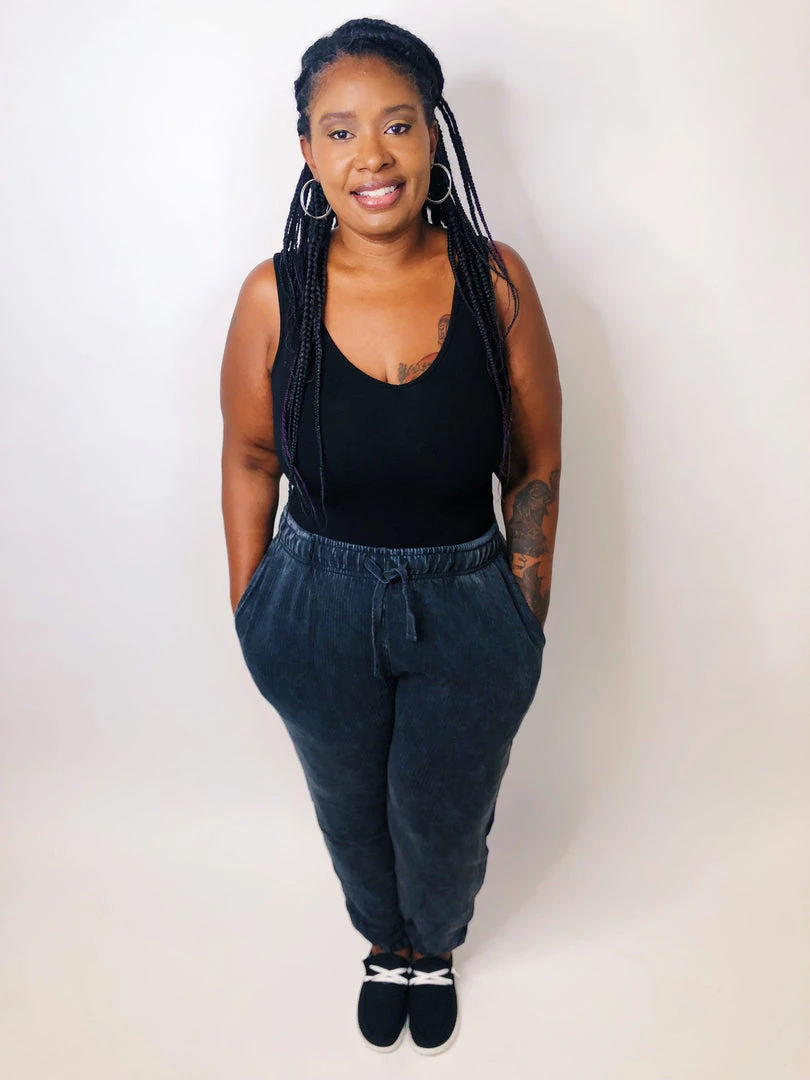 These joggers are really comfortable. The mineral washed color makes it this piece stand out and really versatile, you will need this in your closet. It has side pockets and it’s really stretchy.Β Β