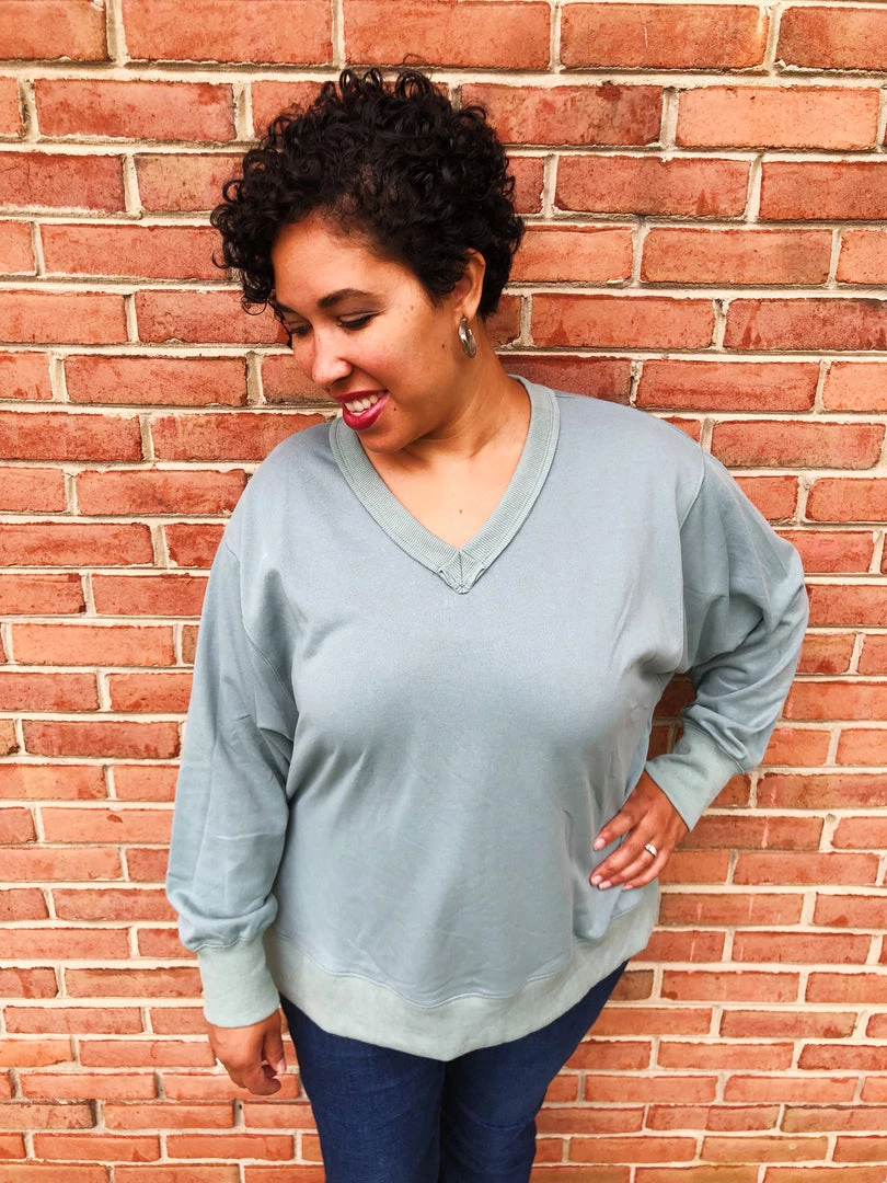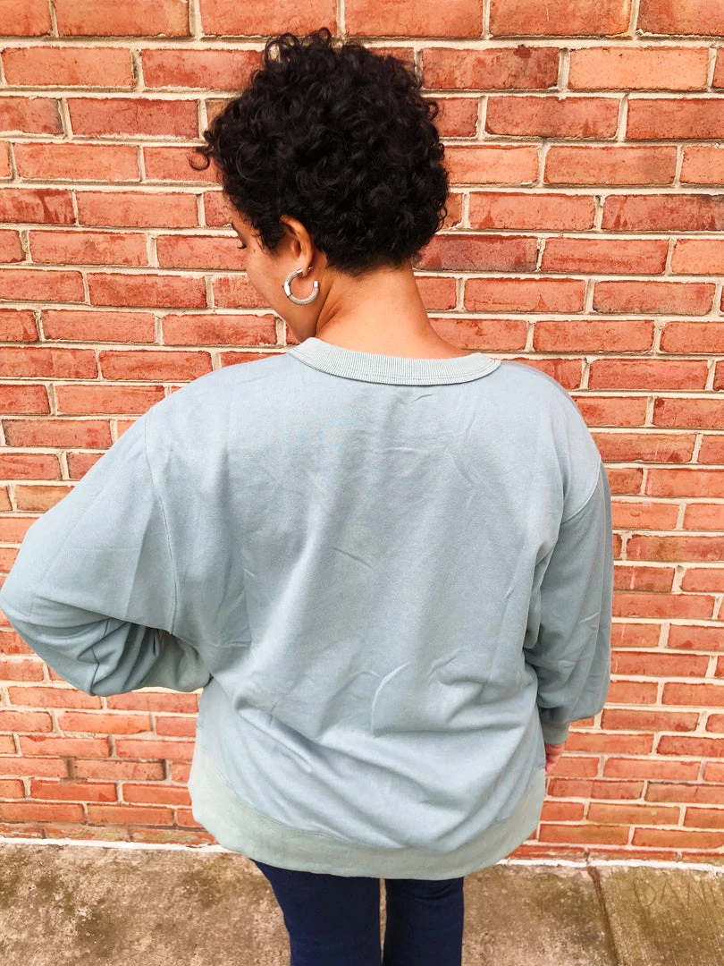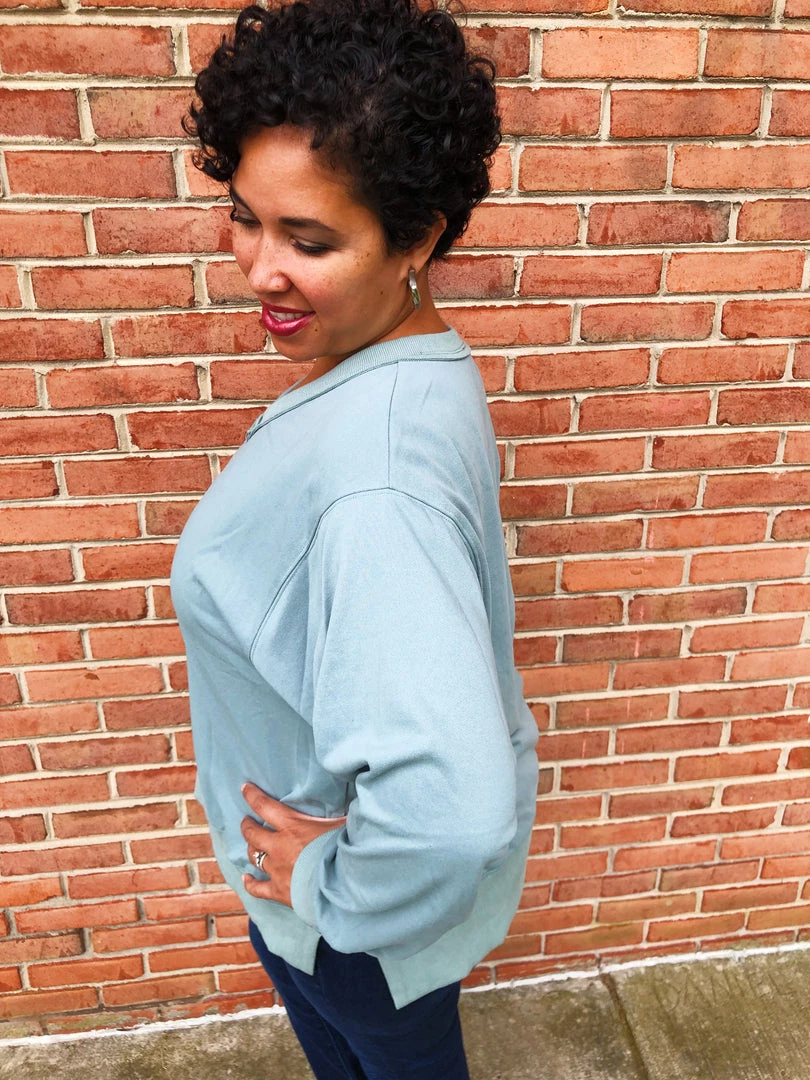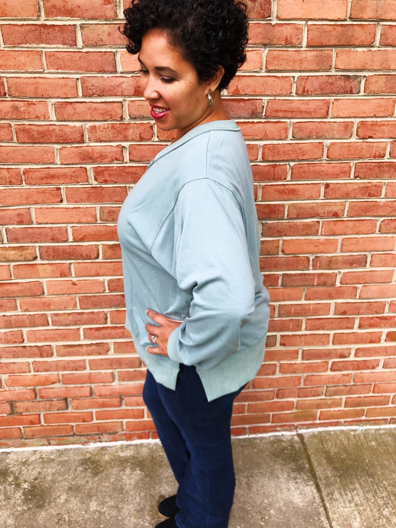 This blue grey sweatshirt it’s so light and comfortable. It features a V-neck and a open detail at the end to give a nice flow and design to this piece. This color it’s just perfect for fall/winter so you can easily pair with anything, and trust us, you will need this sweatshirt in your closet!!