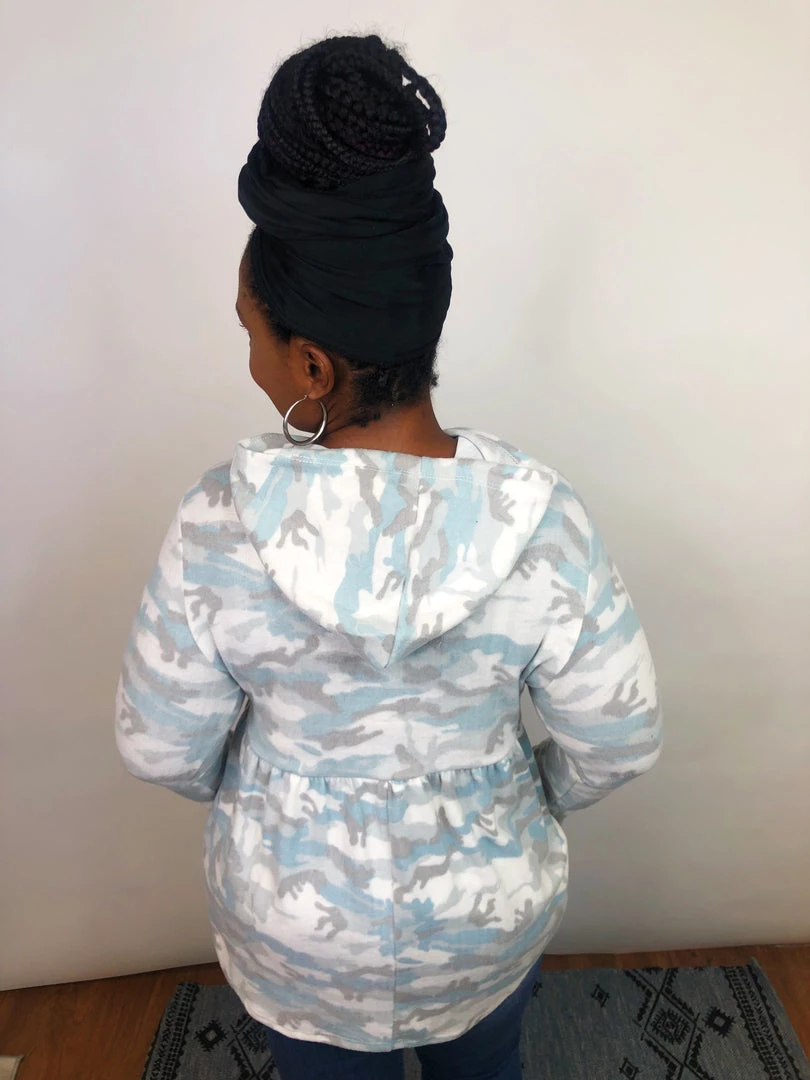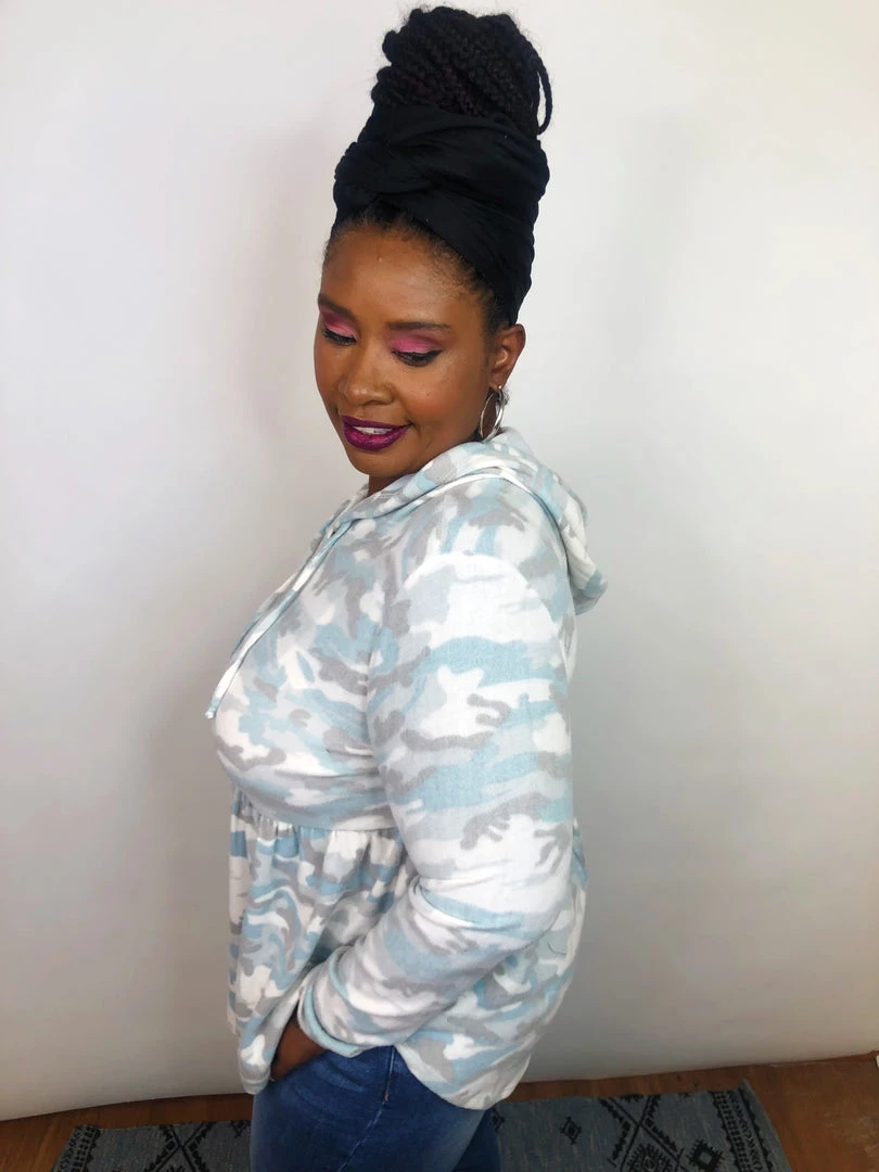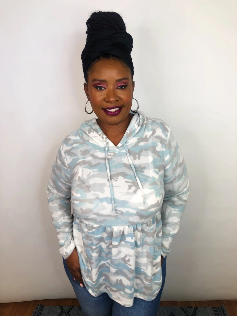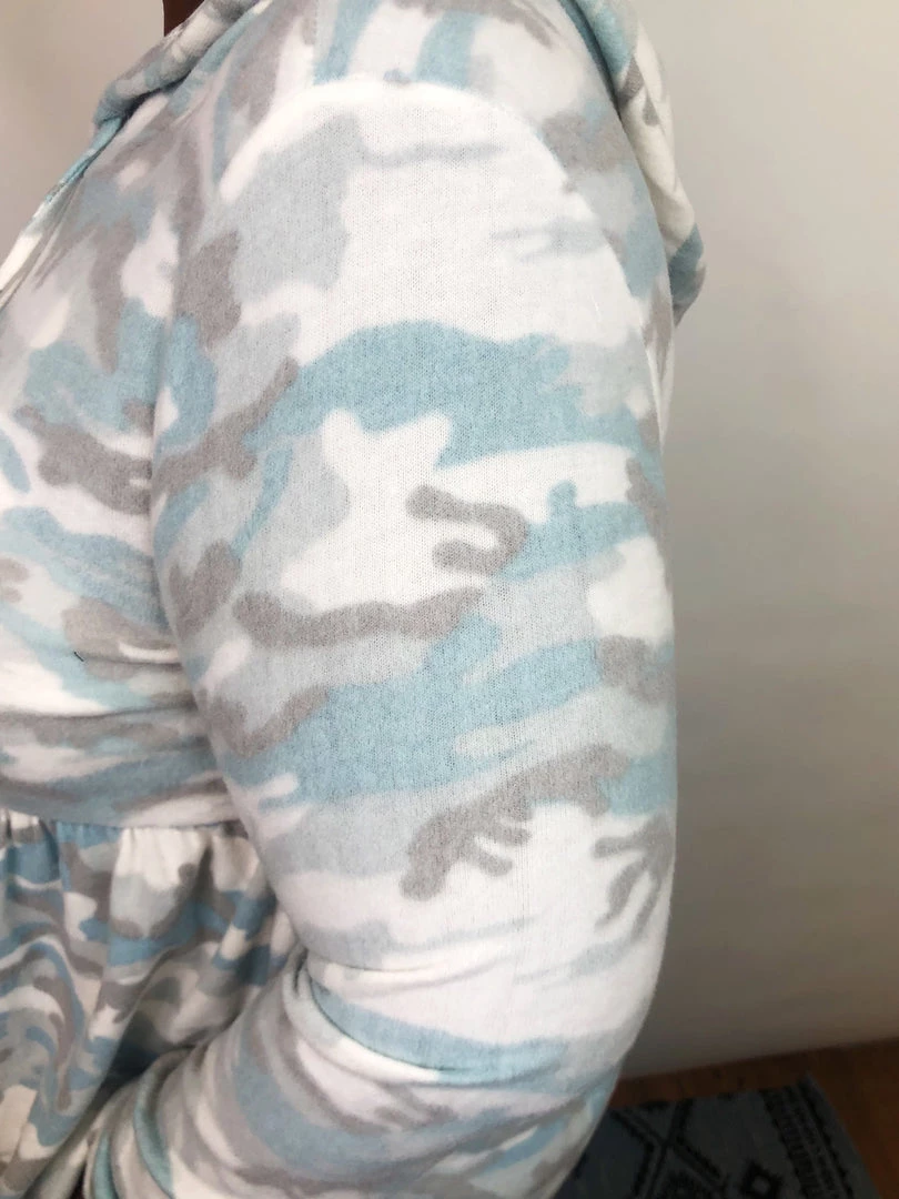 This babydoll top is EVERYTHING! It is so soft and stretchy. The beautiful teal and ivory camo pattern is incredibleΒ and the high low hemline makes sure you have full coverage behind..Β This adorable top also has a super soft hood with drawstrings on it so you can adjust the fit. Snag this warm babydoll top to create a super cute, cozy outfit!