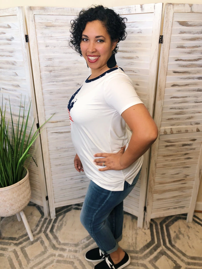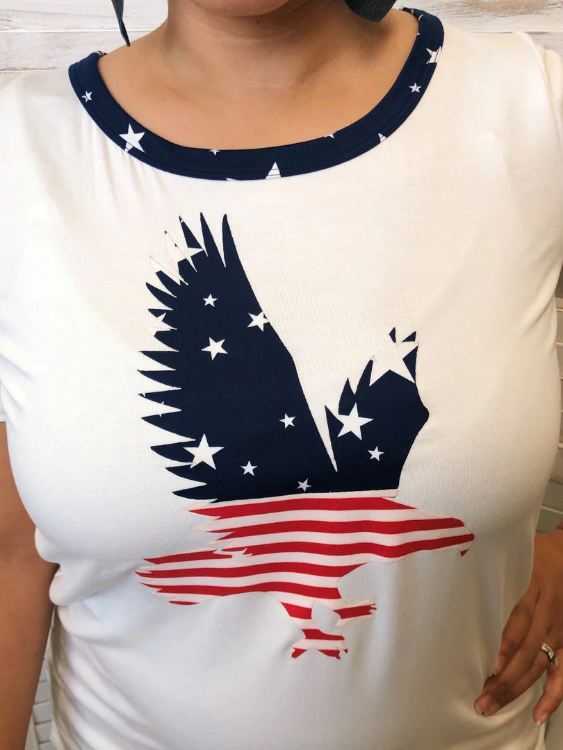 This awesome top features an eagle with the American flag print on it on an ivory back ground and a navy neckline with ivory stars on it. Pair this super soft short sleeve top with your favorite bottoms for a prideful outfit that is sure make you soar through the day.