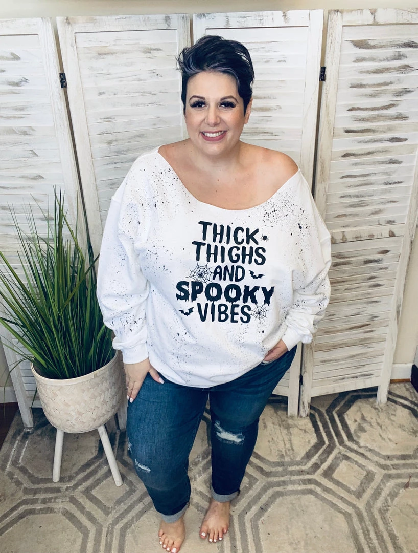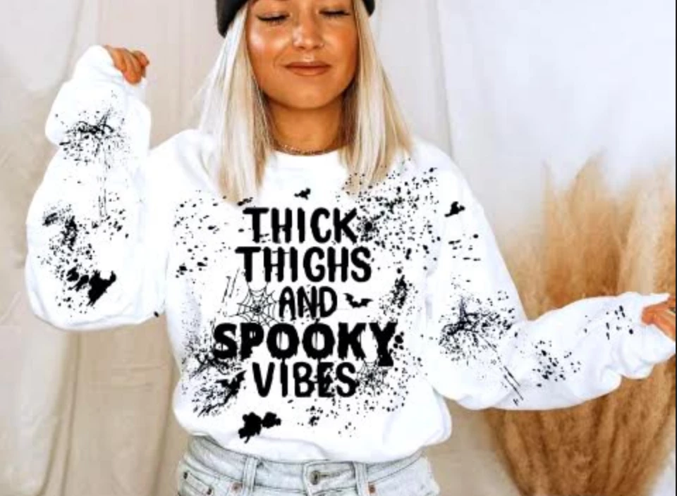 This super cute sweatshirt says,”THICH THIGHS & SPOOKY VIBES,” on it in. This super fun sweatshirt has black splatter pattern on it that is unique to each shirt so no two sweatshirts will be exactly the same! This super soft sweatshirt is unisex fit for a super comfy flattering fit.