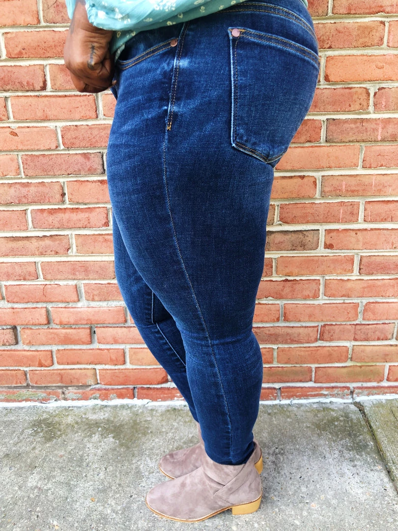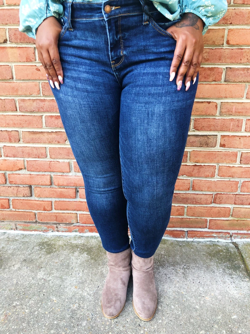 These beautiful medium wash mid rise Judy Blue skinny jeans that we got in features gold lines all around the jeans and that gives the really charm on these jeans. These skinny fit jeans have amazing stretch, and you can easily dress these up or dress them down for a versatile and comfortable pair of jeans, try it also cuffed them, you will love it. For sure a must have to your closet.